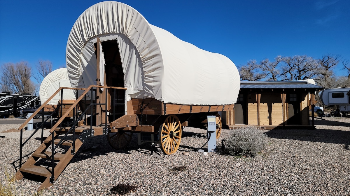 Experience Glamping at its best in the Wild, Wild West! Each wood-framed, canvas-topped wagon accommodates up to four guests with a king bed and bunk bed. Amenities include heating, air conditioning, Wi-Fi, a small refrigerator, outlets for your electronics, and a Keurig coffee maker. Guests enjoy a private heated bathhouse with an enclosed shower located directly behind the wagon. Two Adirondack chairs outside each wagon provide a cozy spot to relax under the Arizona sky.