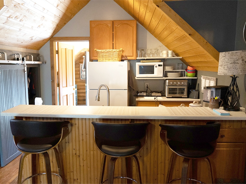 The Bird's nest has a unique spiral staircase with decks on the front and back. Front room has a twin bed and a trundle bed. The living room and kitchen bar area is very open and full of light. The living room has a 55" flatscreen with a large sectional sofa. All new appliances, dishwasher, with every kitchen need you might have. Bathroom has full shower/tub and lots of storage area. Bedroom has queen bed and lots of dresser storage area. 32" flatscreen TV. A beautiful walk out 2 story deck.