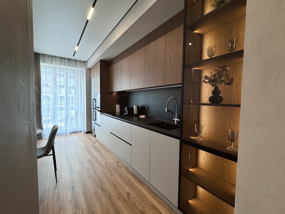 Relaxează-te într-un apartament elegant în inima Chișinăului, cu finisaje din marmură și lemn natural. Te vei bucura de o saltea premium Vi-Spring Bedstead, o cadă spațioasă și un balcon cu șemineu decorativ. Apartamentul are perdele cu telecomandă și espressor cu cafea pe boabe Blocul beneficiază de recepție și pază 24/24, oferindu-ți un plus de siguranță, confort și liniște pe durata întregii șederi.