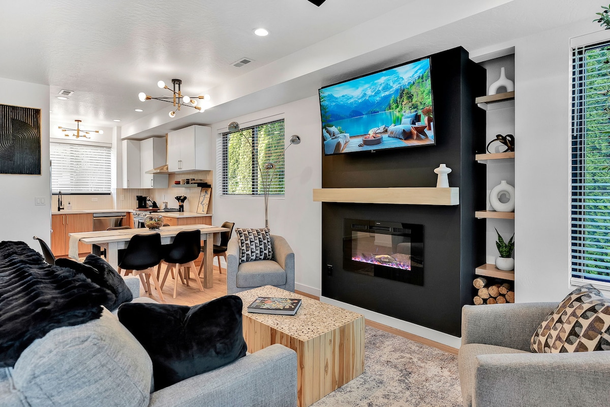 Come and stay in this new (2020 build) modern upscale townhome in a prime location! Open layout with tall ceilings and lots of windows! 52" gas linear fireplace! 70" TV in living room, 55" TV in master! Fully equipped high-end gourmet kitchen with large island! Spacious master suite with King size bed, separate bathroom and WIC. High quality bedding throughout! 2nd bedroom bunk bed full over queen, 3rd bedroom queen bed+ flex area couch sofa, sleeps 10! Minutes from CDA downtown waterfront......