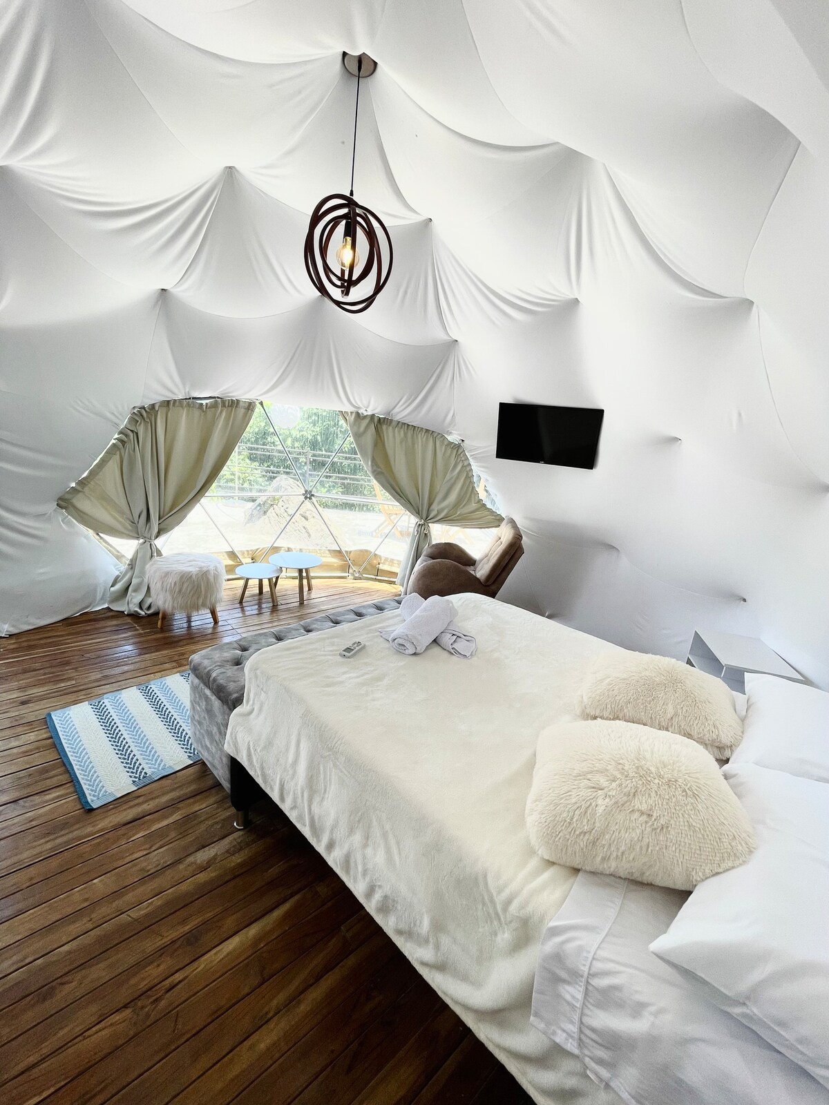 Un rincón mágico con tres glamping, sobre un deck de madera que respeta la geografía natural; incluye una cama doble, baño privado, agua caliente, preparación bebidas calientes, catamarán al lado de glamping y una zona inferior con hamacas y una silla doble con cojines, todo para disfrutar de los sonidos del río, los cantos de las aves o las estrellas al caer la noche. Además, se cuenta detalles artesanales y elementos cuidadosamente seleccionados para crear un ambiente acogedor y reparador.