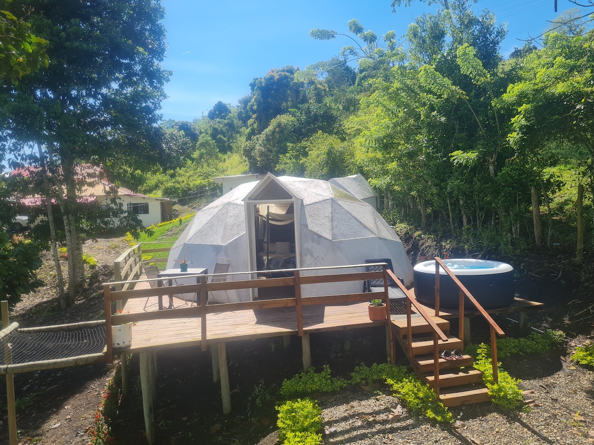Disconnect from your worries in this spacious and serene space. Coffee farm where you can connect your mind and body with nature, enjoy a pleasant climate and beautiful sunsets. Perfect Place To rest and disconnect from everyday life you will be able to spend unforgettable moments You will enjoy the birds singing, it is ideal for couples - It has a transparent Dome Glamping, Jacuzzi, outdoor shower, Breakfast 🍳 Included.
