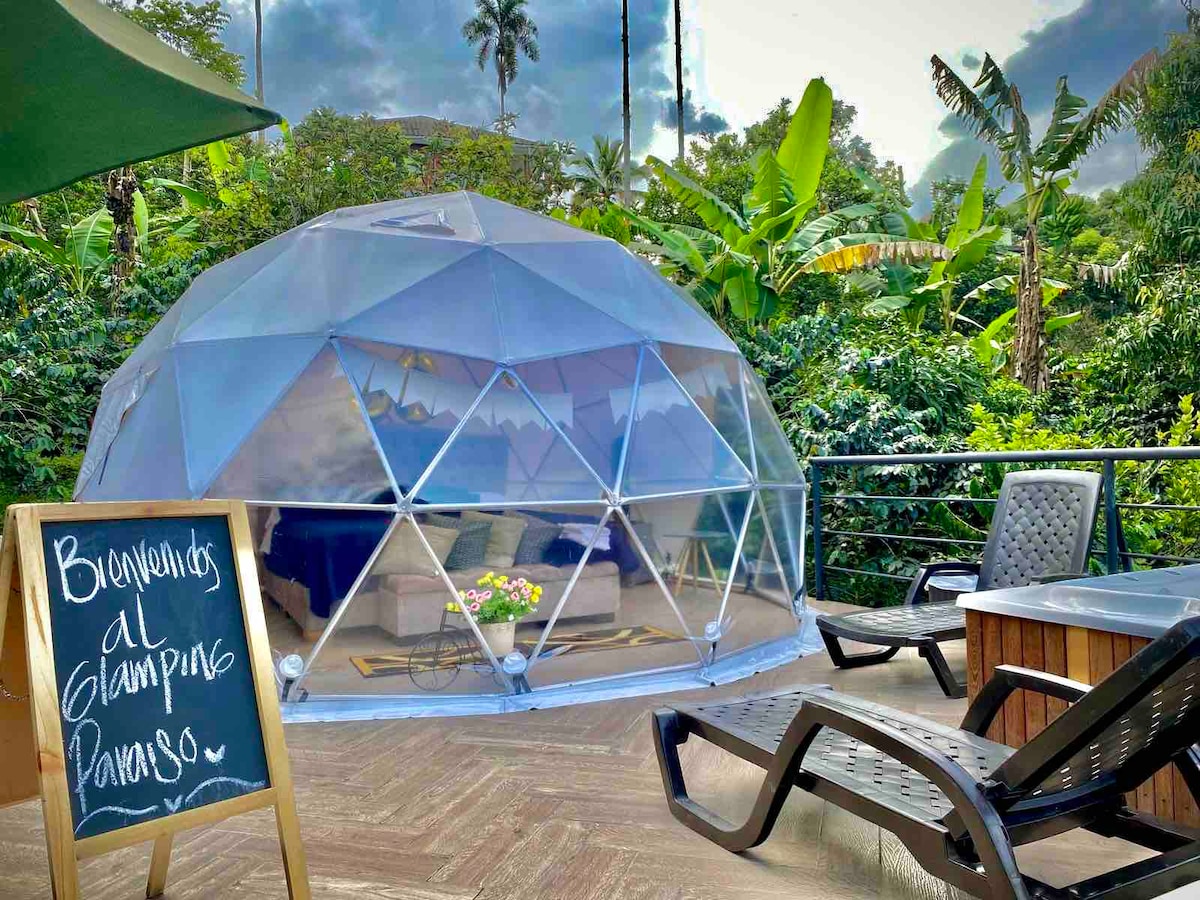 Disconnect from your worries in this spacious and serene space. Coffee farm where you can connect your mind and body with nature, enjoy a pleasant climate and beautiful sunsets. Perfect Place To rest and disconnect from everyday life you will be able to spend unforgettable moments You will enjoy the birds singing, it is ideal for couples - It has a transparent Dome Glamping, Jacuzzi, outdoor shower, Breakfast 🍳 Included.