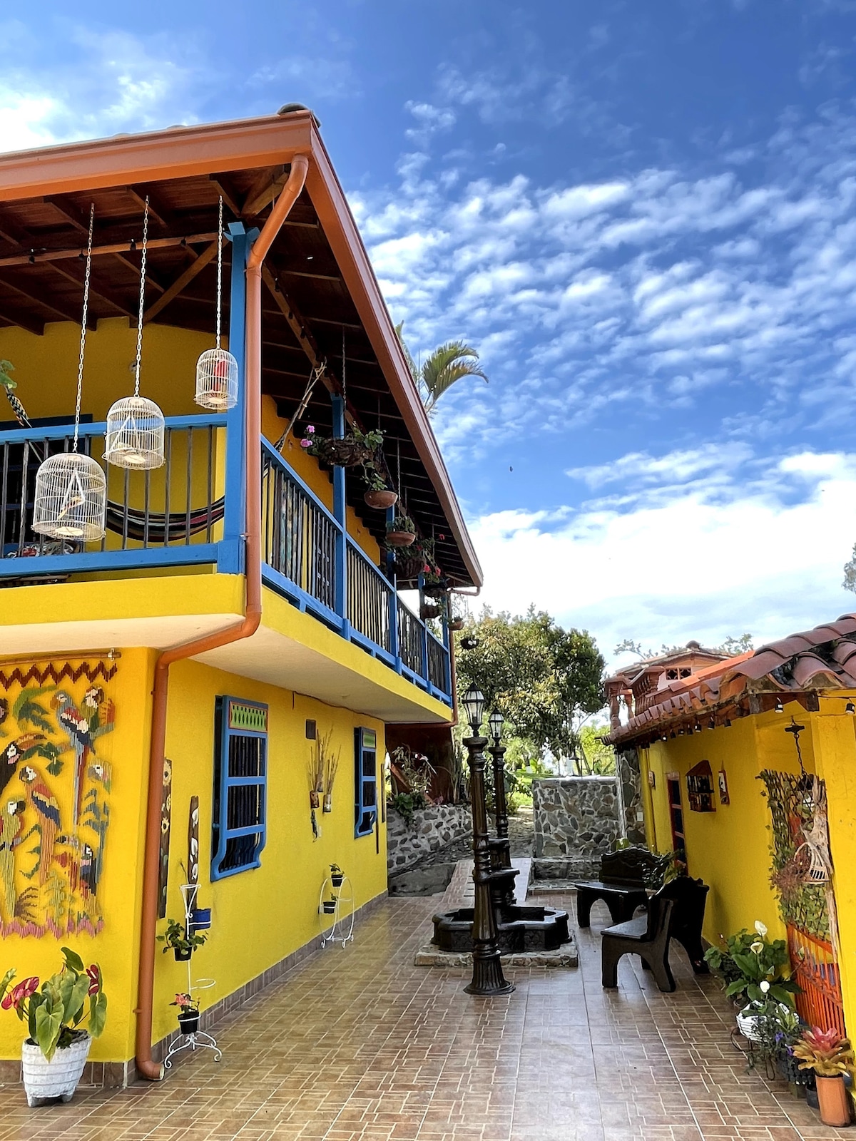 In the heart of Colombia's lush landscapes, a luxurious country home stands surrounded by vibrant coffee farms. Quaint Colombian cabins dot the scenery, exuding a blend of rustic charm and modern comfort. This oasis is a haven of tranquility, harmonizing with the symphony of tropical birds and the aroma of fresh coffee beans. The landscape is adorned with an abundance of greenery, where exotic fruits thrive, creating a picturesque retreat for those seeking a serene escape. 16+ guests