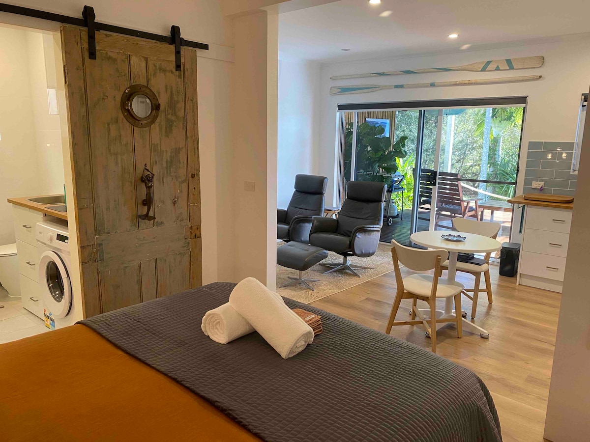 A light and airy, newly renovated 100 year old barn, using recycled materials lovingly restored by our local super skilled friends. Just 3 minutes walk into beautiful Bellingen town. Private and secluded in the grounds of our home with its own laneway entrance. We are a family of 4 with our dog and our cat. Super comfy king size bed. The property isn't suitable for young children.