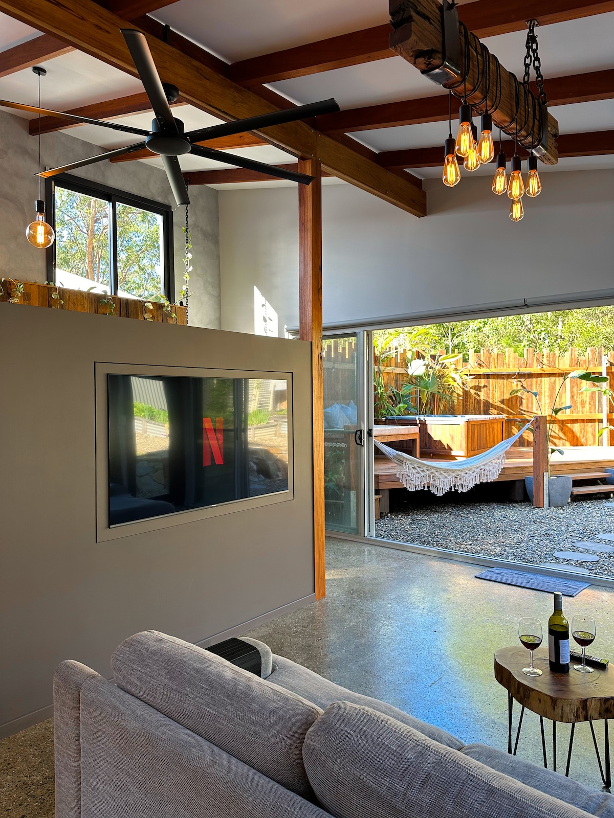 Located in the heart of Coffs, our uniquely designed Coastal Hamptons Cottage is an easy stroll to the city centre, restaurants, bunker cartoon gallery, botanical gardens and a short drive to the pristine beaches and Jetty. Ideally suited for couples, families and business stays. Engulfed in natural light, the living area, with high raked ceilings is the perfect place to start your day. While the north facing deck and private garden is the ultimate spot to spend happy hour