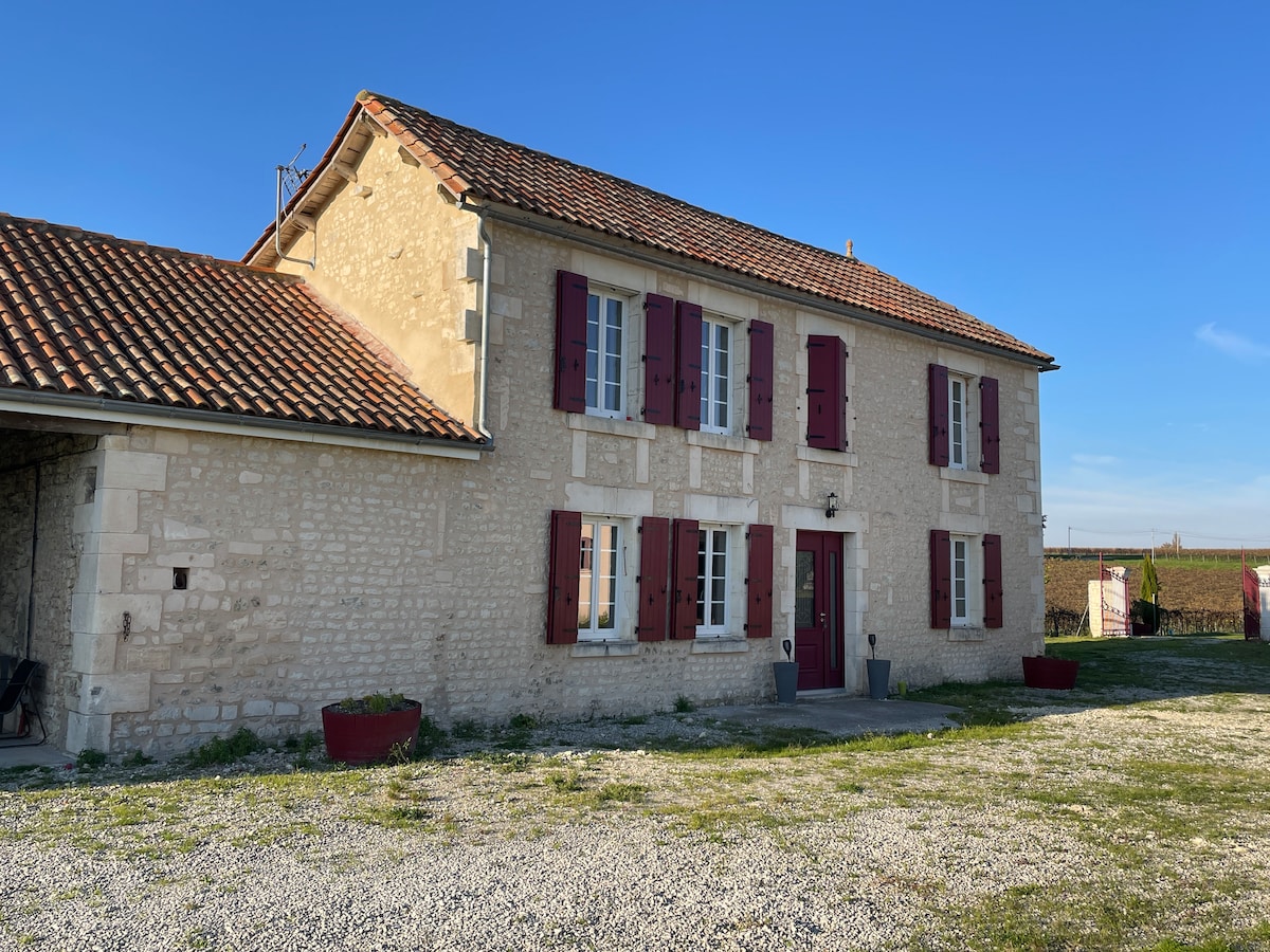 Joli corps de ferme rénové au coeur du Cognaçais avec accès piscine partagée et PMR. Située dans les coteaux de la Grande Champagne, le Chai est idéal pour les familles et offre un cadre de vie campagnard avec des prestations de qualité. Pièce de vie spacieuse avec poêle à bois (bois à volonté). 4 chambres en suite (dont une en accès PMR). Jardin arboré privatif. Frais l'été! Accès à une grande piscine. Connexion internet haut débit. 5 Vélos à disposition sur place (4 adultes et 1 enfant).