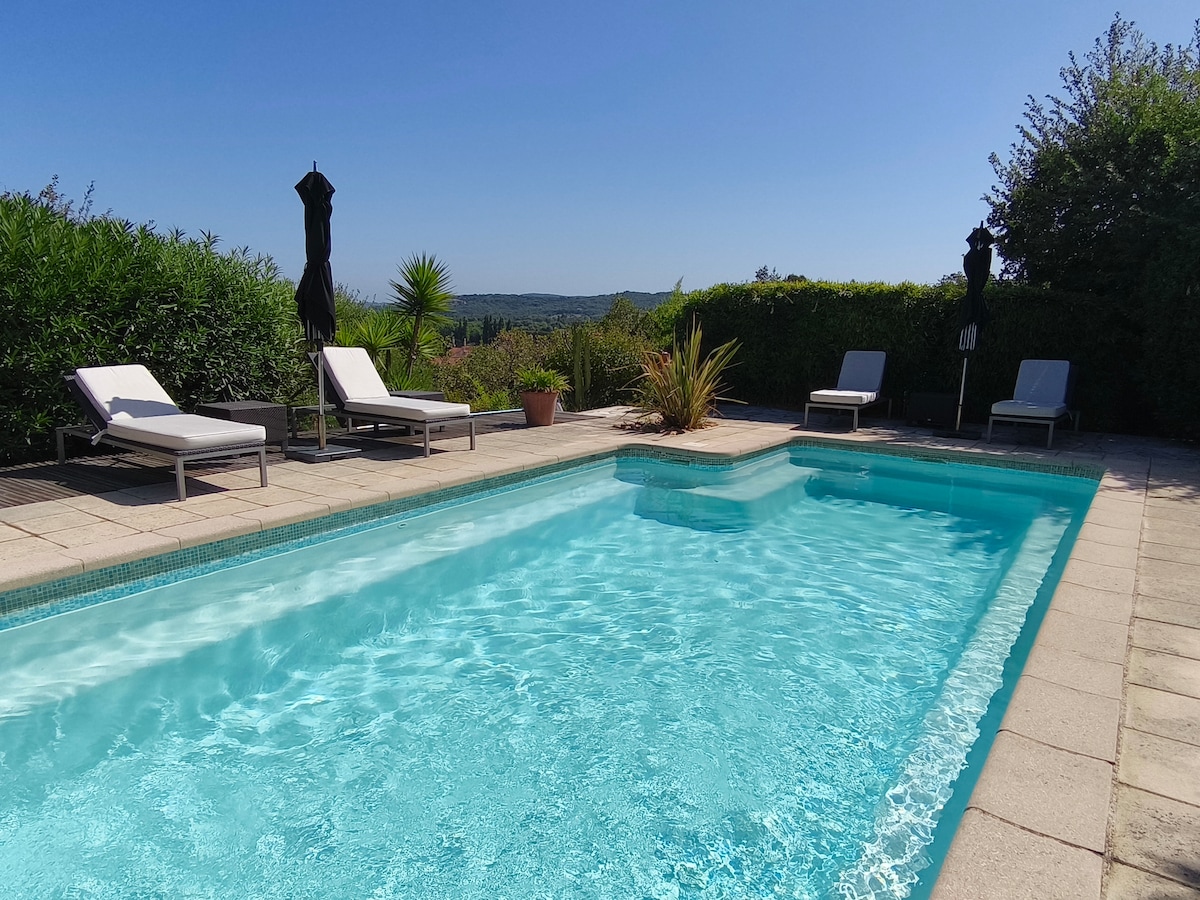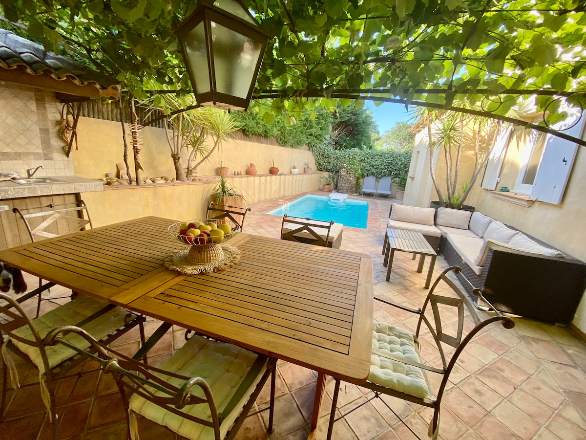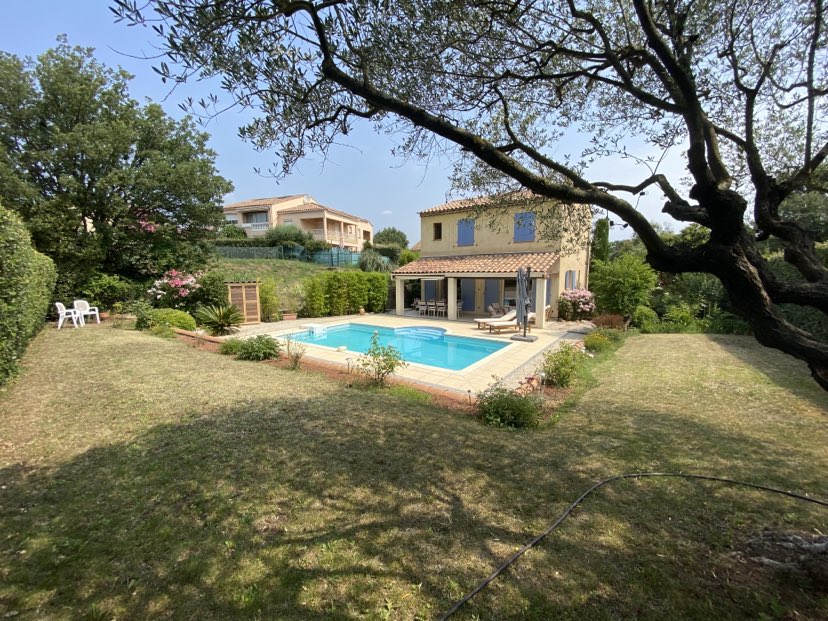 dans le golfe de st tropez à grimaud, magnifique villa nichée dans un écrin de verdure . Vous profiterez d'un jardin de 2200 m², d'une piscine privée, d'un terrain de pétanque, d' une salle zen et de grandes terrasses aménagées. La villa décorée avec goût est entièrement climatisée. elle se compose : . 1 cuisine équipée ouverte sur séjour salle à manger de 100m² . 4 chambres ( 3 lits de 160 et 1 de 180cm ) . 3 salles de bain dont 1 avec baignoire . 1 bureau La villa bénéficie du calme absolu