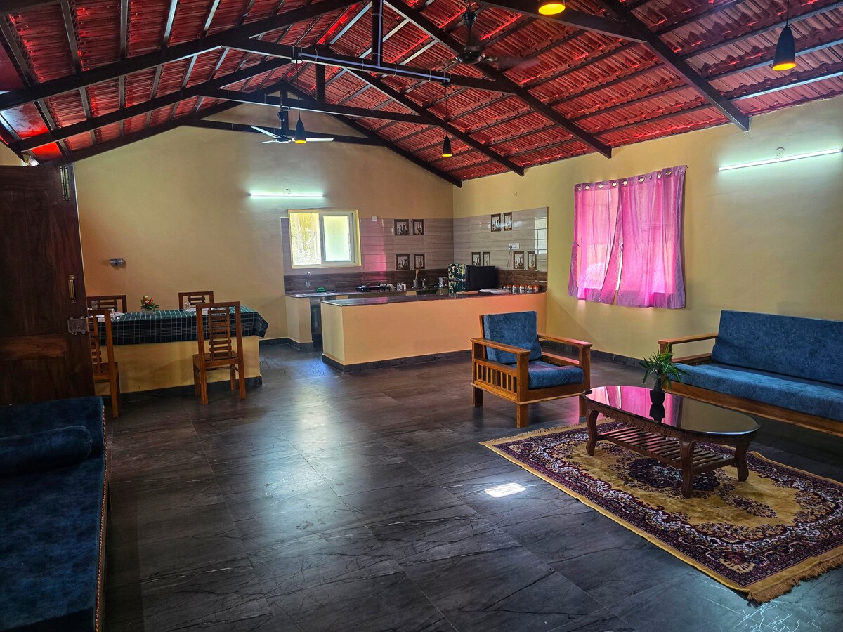 A calm, green retreat just a 30 minutes drive from Isha Yoga Center—ideal for spiritual travellers, or families who wants a peaceful break surrounded by nature. This 2BHK independent villa is located in a quiet and safe residential area, with lush farmland on both sides. You'll wake up to the sound of birds and fresh air—yet still have all modern comforts.
