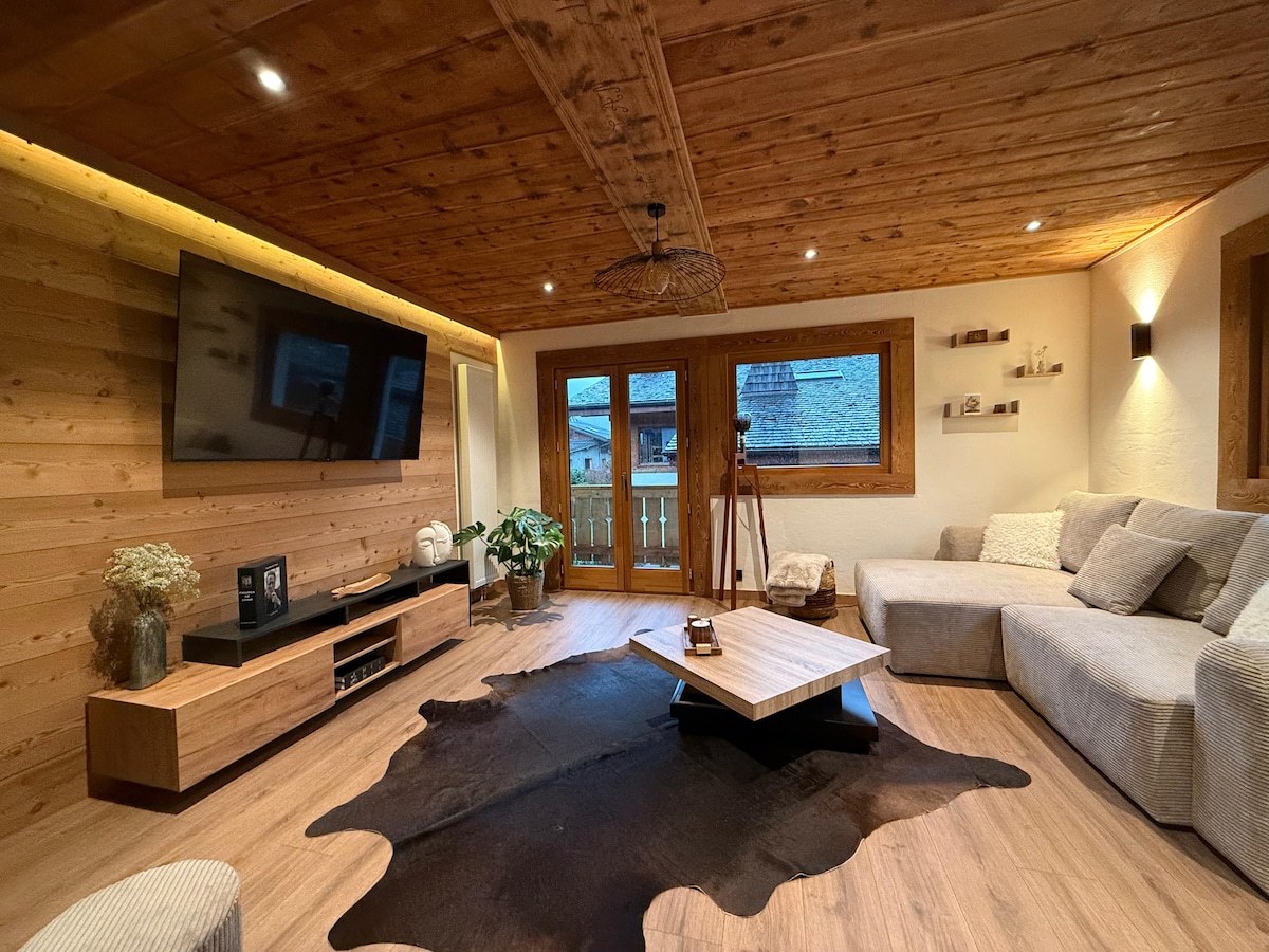 Add logs to a fireplace with a massive stone hearth and recline on a rustic wooden sofa. Gaze through picture windows at the alpine forest surrounding an authentic chalet. Return from the slopes and unwind in a luxury sauna in a cabin-chic bathroom. Une chambre de 25m2 avec lit double, rangements, armoire authentique. Un salon chaleureux et spacieux avec double baies vitrées donnant sur le Mt Blanc et cheminée. Et un sofa banquette convertible en 2 lits individuels. Cuisine pratique et toute équipée. Une salle de bain en granit avec douche et sauna 3 personnes. Une terrasse devant forêt et ruisseau ( avec fréquente visite des biches - voir photos ), avec fontaine et vue imprenable sur le massif du Mt Blanc. The chalet is an individual construction fully available and reserved for the guests. So are the terrace and the surroundings ( a small river, a private bridge and access to the forest ). A disposition pour toute question. Dans le hameau de Coupeau : Chalet authentique dans la forêt au-dessus des Houches avec vue exceptionnelle sur le massif du Mont Blanc. En Bord de petit torrent avec des biches A 5 min en voiture des Houches, à 10 min de Chamonix, à 1h de Genève. Easy access by road to the chalet. 2 kms from Les Houches and 10 kms from Chamonix. Parking just behind the chalet A fully renovated old chalet. With all modern comfort ( inc Sauna for 3 ) and top decoration. A unique view on the MontBlanc chain. The chalet is in the hamlet of Coupeau, in the forest above Les Houches, with exceptional views of Mont Blanc. It's a 5-minute drive to Les Houches, 10 minutes to Chamonix, and an hour to Geneva.
