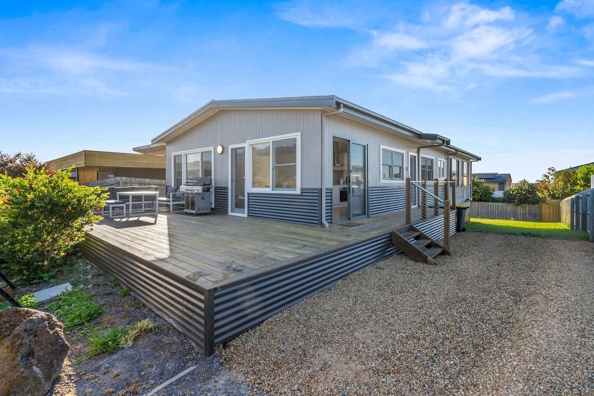Modern beachfront townhouse with the comforts of home. Just walk across the road to the beach Walk to the town center, restaurants and supermarket or cross the street and you are at the beach. If the weather is bad curl up on our comfy couch, use the playstation or take a luxurious bath. On warm days enjoy the backyard and bbq! 1 King bed in the master bedroom up on level 2, full Ensuite including Bath 1 Queen bed in the ground floor second bedroom, including full bathroom