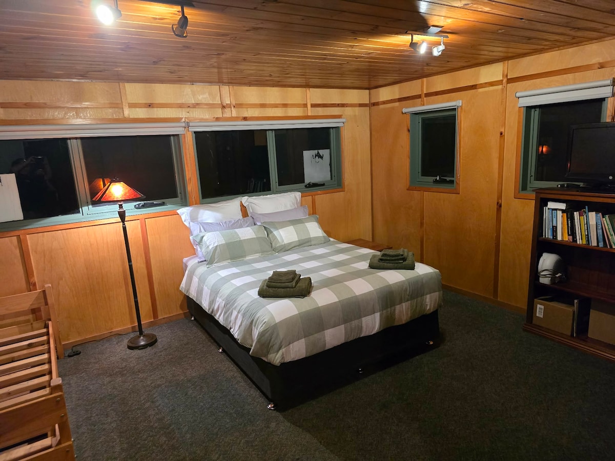 Perfect Couple's Retreat - A fully self-contained cabin tucked in a peaceful bush setting on the edge of the Otway State Forest. Surrounded by a former vineyard, native wildlife is abundant—kookaburras, blue wrens, ducks, kangaroos, echidnas, and wallabies all visit. Inside, enjoy a sunken spa in the open lounge, full kitchen, laundrette, private bathroom, and undercover parking. Step onto your own deck to unwind, soak in the tranquillity, and watch the bushland come alive around you.