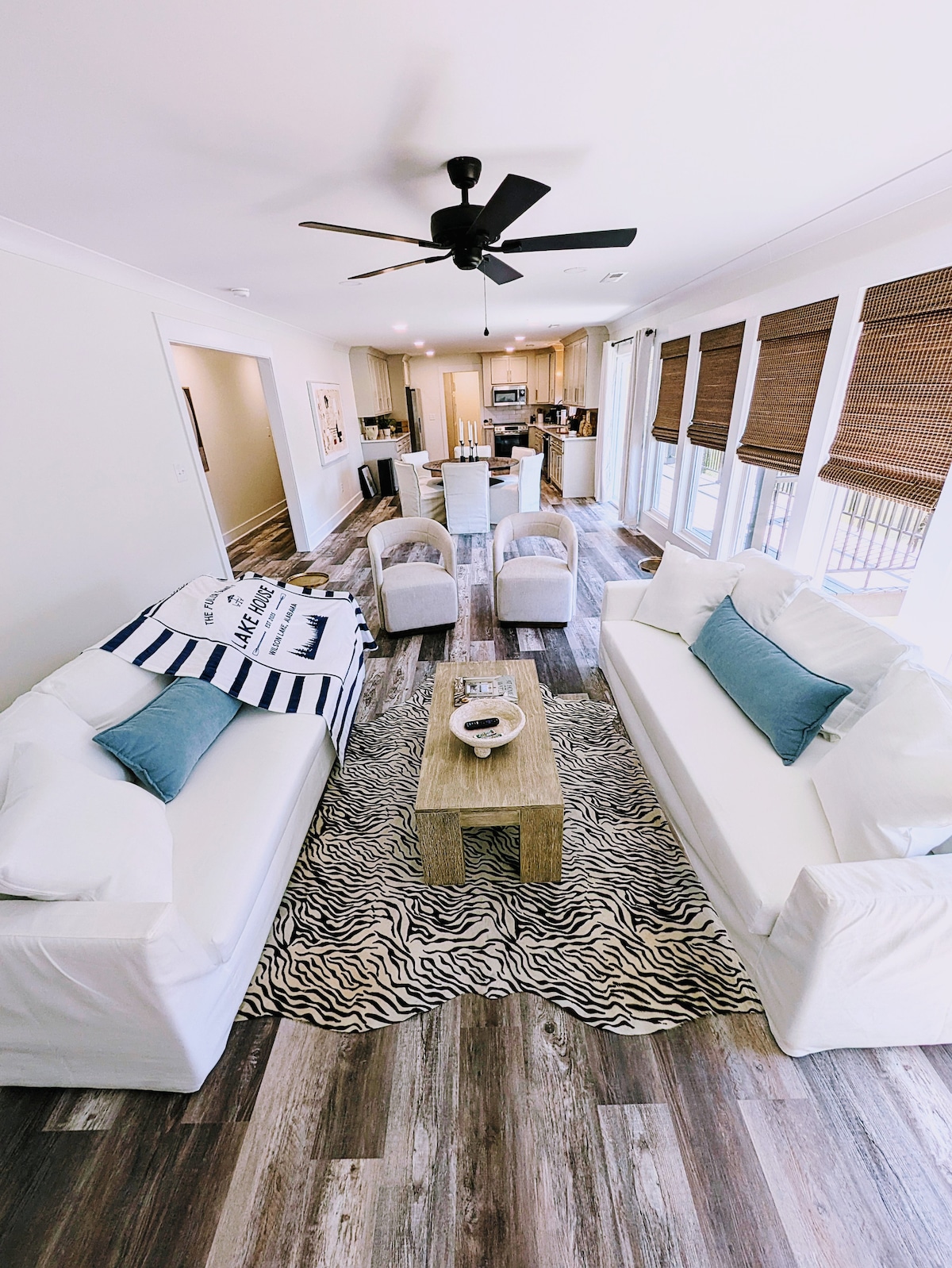 A beautiful newly renovated lakefront home located on Wilson Lake. Less than 5 min drive to Turtle Point Country Club, shopping, and restaurants. 3 bedroom, 2 full baths, pull out sofa & roll away bed to accommodate up to 8 guests. Fully furnished kitchen with stove, microwave & stainless appliances. Large level back yard with hammock. Boat dock equipped with double chase lounger, table, & chairs. Large deck with tables and chairs to seat the entire family and Traeger wood pellet grill
