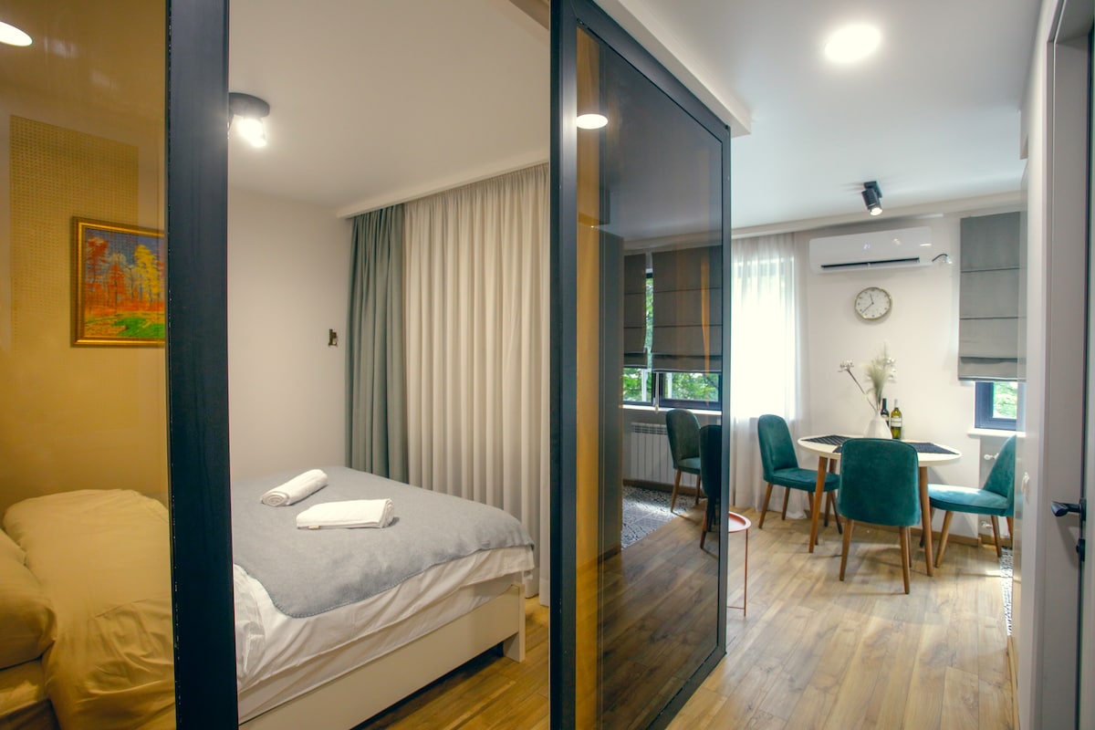 Enjoy a stylish vacation in the heart of the city. The apartment is quiet and cozy, but you leave the house and in a minute you are immersed in the world of wonderful aromas of Georgian cuisine, beautiful buildings and unsurpassed nature. Walk through the friendly streets of Kutaisi and you will want to stay here forever