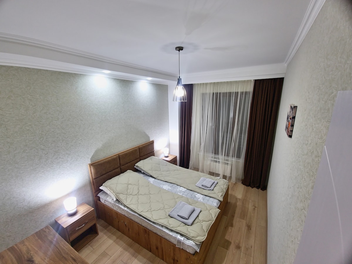 Our brand new apartment is located in a cosy environment at 4 Korkia Street (entrance from Tamar the Quees Street) in the very center of Kutaisi city. There are 2 bedrooms, 2 bathrooms, spacy living room with TV, kitchen, air-conditioning, heating and all necessary things that the guests might need. Our guests will feel a very comfortable atmosphere in our apartment which is located within a few minutes walking area from the main square, markets, restaurants, bars and bus stops.
