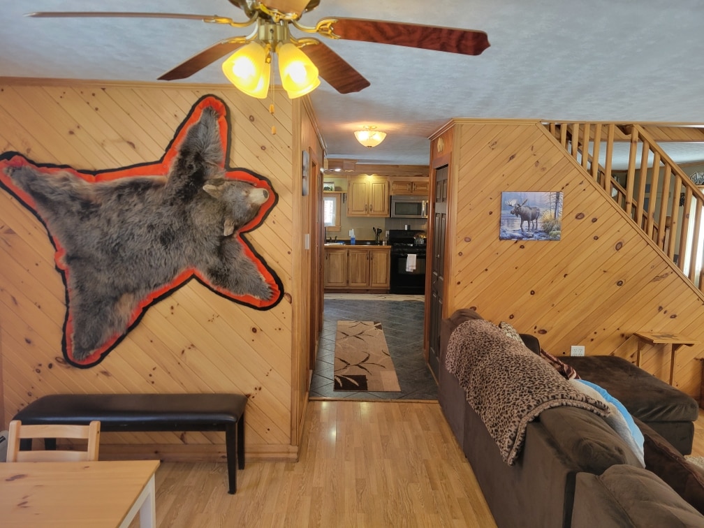 Settled on top of rolling mountains on a snow mobile and ATV trail that overlook Quebec, Canada, Vermont, and NH it is an ideal getaway for those who are looking to go remote with many of the creature comforts of home. The Deck outside makes a perfect spot for morning coffee or lounging all day. 8 miles into town for anything you may require and close access to the Canadian Border, as well for a special international flavor