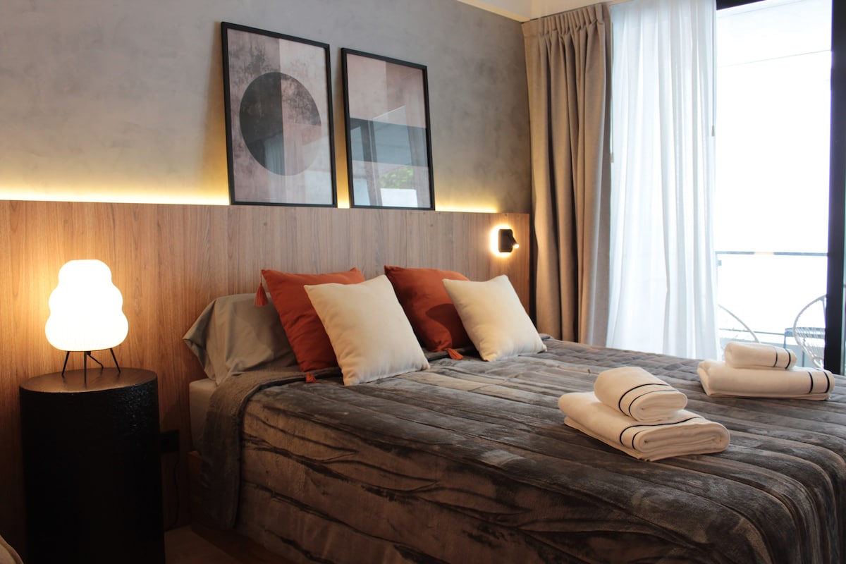 Brand new studio apartment with a full kitchen, bathroom, and balcony offering great views in the heart of Palermo Hollywood. Full of natural light! Modern decoration, fully equipped, and secure. SmartTV with cable and Netflix (login with your account). The building offers excellent amenities: heated indoor pool, outdoor pool with solarium, spa with massage room and sauna, gym, chill-out terraces, meeting room, and BBQ area. Walking distance to top restaurants, bars, cafes, and public transport.