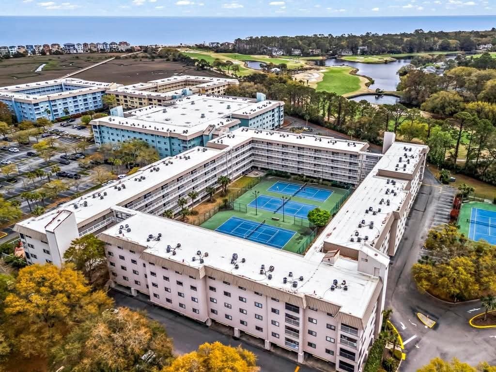 Newly updated 2 Bedroom/2 bath villa includes private patio deck. Highly desired Building #2. Located steps away from 3 onsite pools (1 indoor pool,1 seasonally HEATED outdoor pool ) .Take a scenic 5 minute walk across a private saltwater marsh boardwalk to the beach. Guests have access to laundry, beach, fitness center, Indoor walk track, sauna, steam,seasonal golf cart shuttle. Enjoy 6 lighted tennis courts , grill/picnic area, bar ,general store and deli located pool side. Elevators on site.