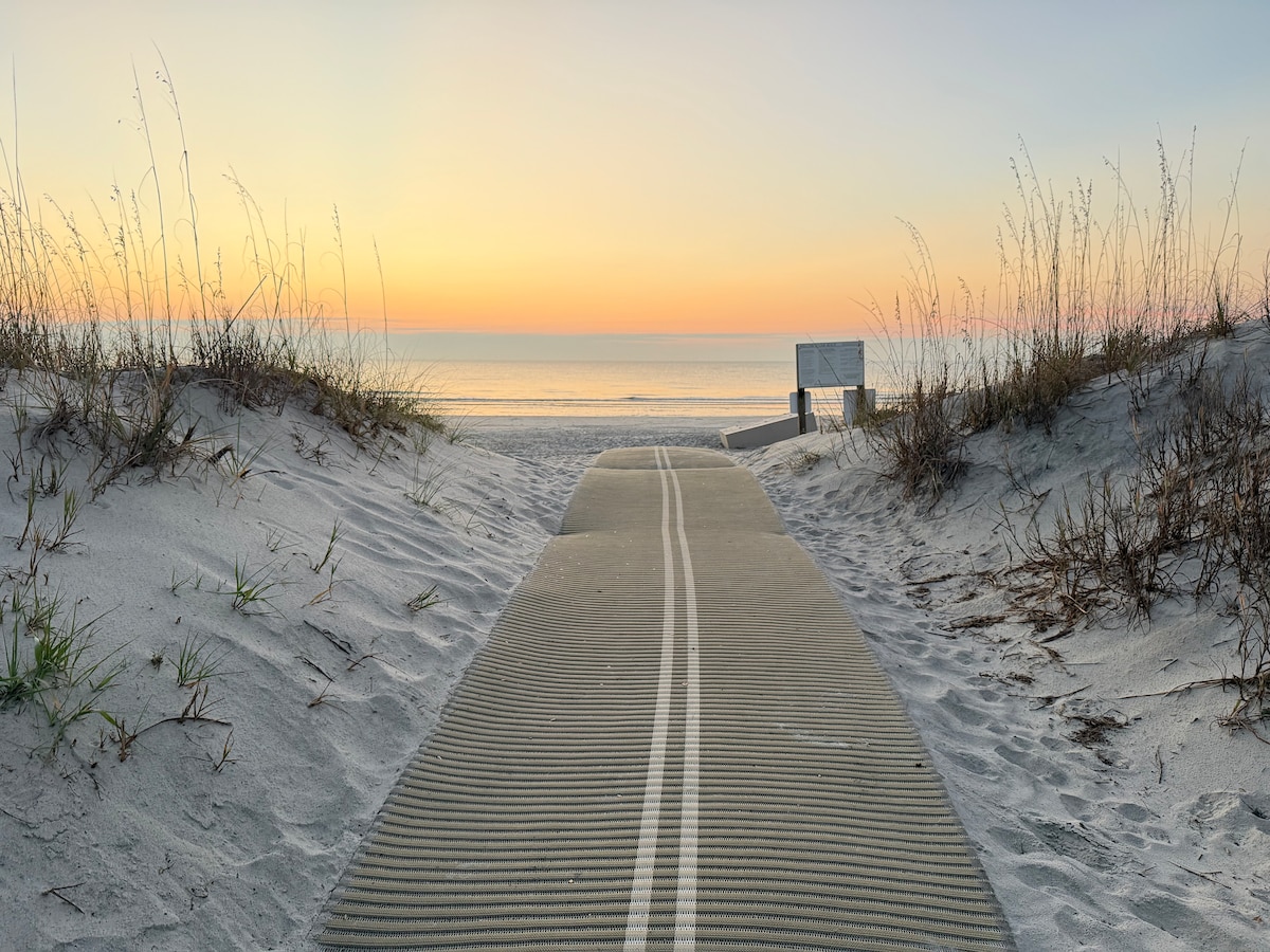 A modern outlook on beach life! 2 bedroom, 2 bath beach villa that sleeps 5 comfortably on memory foam mattresses. Relax in the living room after a long day in the sand. Fully stocked kitchen to cook most any meal you want to whip up! Parking and check in are easy! 5-10 minute walk to the beach across the scenic boardwalk! Watch the crabs scurry along the marsh or turtles swim in the tidal creek. Lots of wildlife to watch! Enjoy the complimentary golf cart shuttle that runs hourly in season.