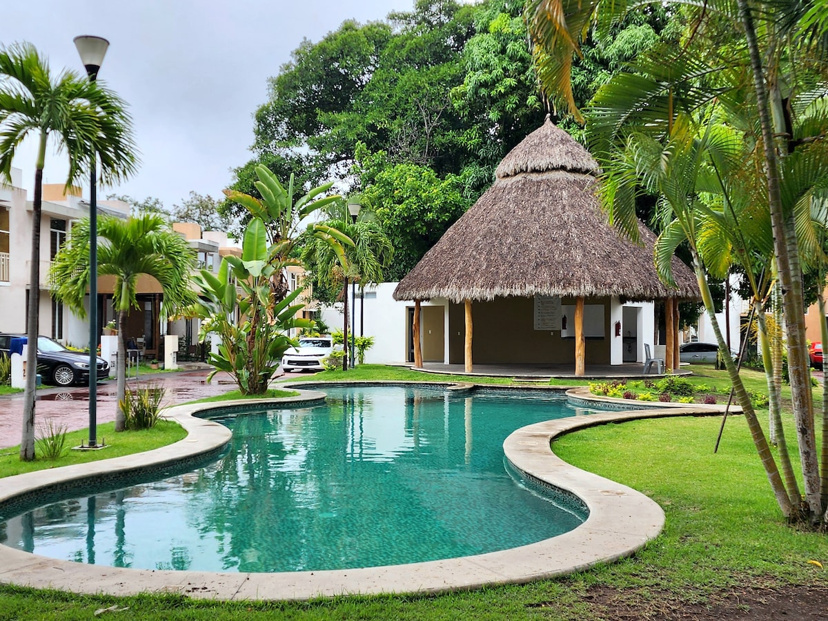 Relájate en este acogedor y bien equipado departamento con aire acondicionado y alberca, ubicado en un fraccionamiento privado y tranquilo en Colima. Cuenta con 2 recámaras (una cama king size y una matrimonial), perfecto para parejas, familias o viajeros de trabajo. Disfruta del cálido clima tropical de Colima, con tiendas, restaurantes y servicios a pocos minutos. ¡Privacidad, comodidad y una excelente ubicación para tu próxima estadía!
