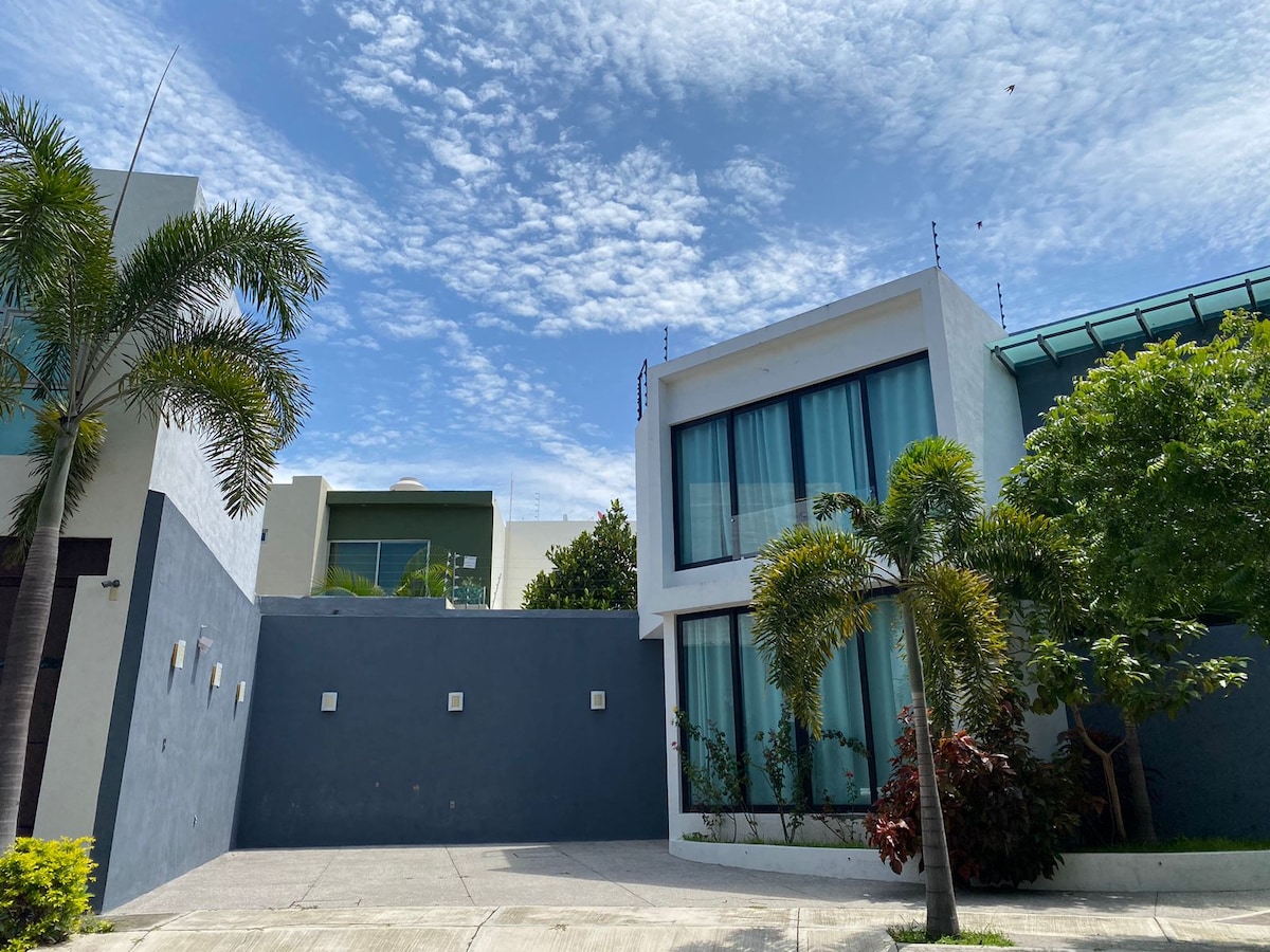 Cómoda, bonita e impecable casa moderna que goza de grandes espacios para disfrutar, descansar y relajarte. Excelente ubicación, se encuentra a muy corta distancia de tiendas, supermercados y restaurantes. La casa cuenta con: ~Recámara con A/C ~Ventanales panorámicos al área de piscina ~Cocina completa con utensilios básicos ~Comedor principal ~Comedor al aire libre en área de la piscina ~Sofás en área de TV. ~Piscina (Privada) ~Gimnasio ~2 Baños completos (planta alta y baja) *No Mascotas