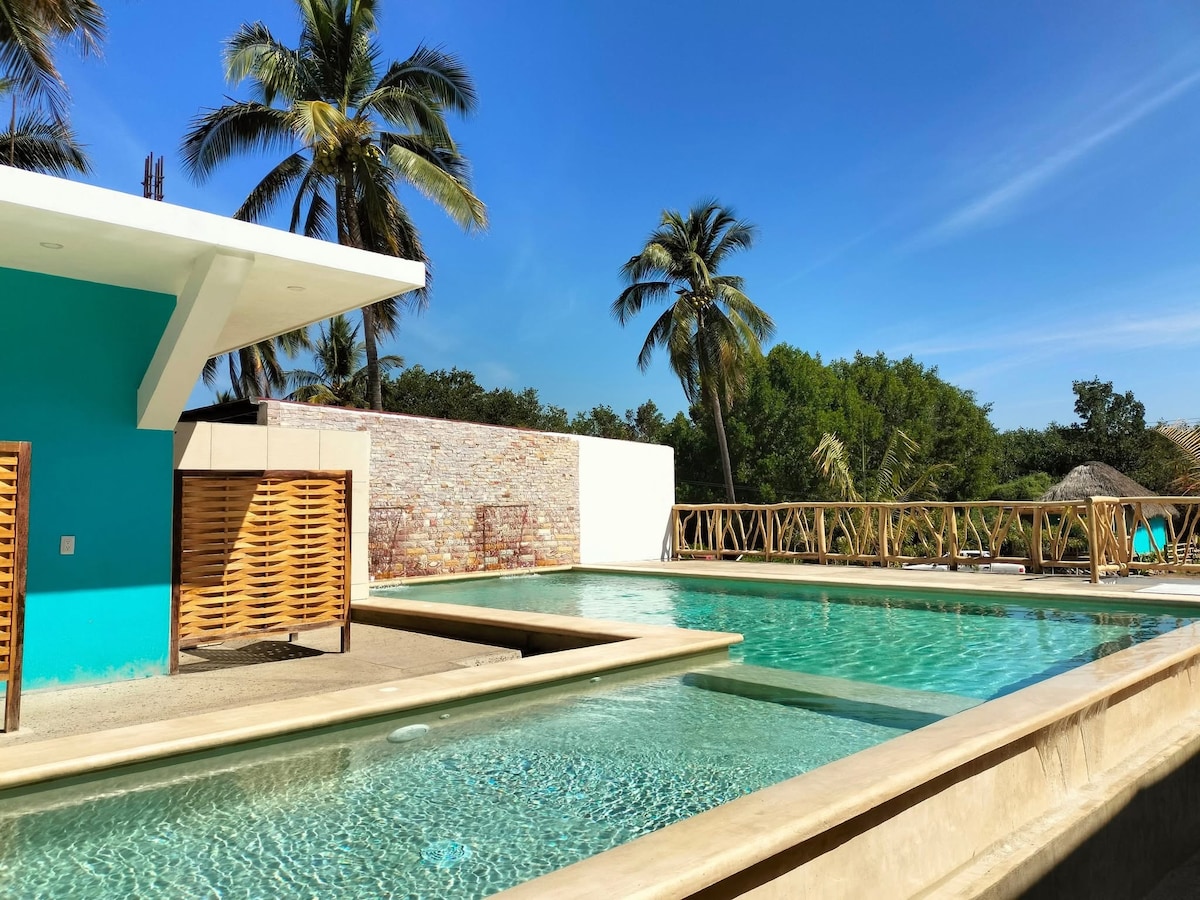 Amplio bungalow en hotel boutique frente al mar en Melaque, ideal para familias o grupos de hasta 6 personas. Cuenta con cocina totalmente equipada, comedor, sala con ventilación natural, aire acondicionado, ventiladores de techo y balcón privado con vista a la alberca y al mar. Disfruta de un ambiente cómodo, luminoso y tranquilo en un alojamiento con acceso directo a la playa y elevador..