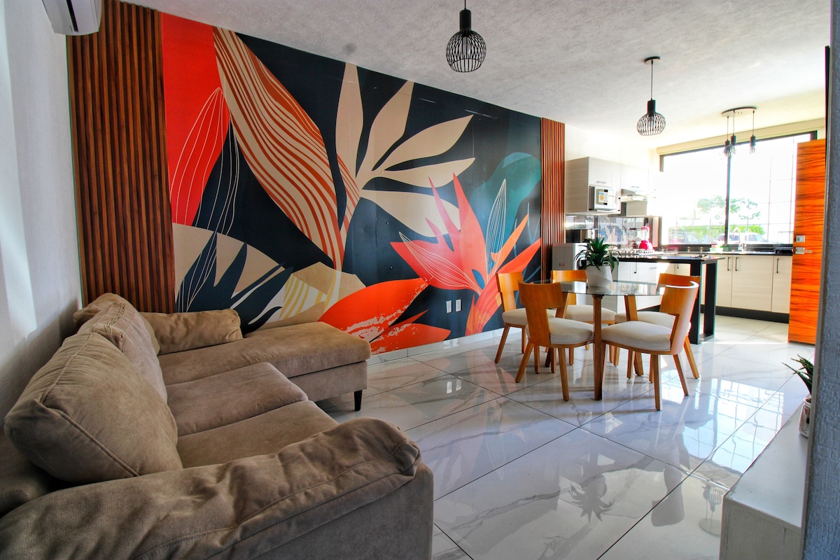 Vive la experiencia de alojarte en un departamento nuevo en la zona residencial más bonita de Colima, en un ambiente privado, de arquitectura destacada, espacios amplios, frescos y ventilados, con todas las comodidades. Este alojamiento ofrece una ubicación céntrica para visitar los mejores restaurantes de la ciudad. Calle poco transitada y a la vez súper próxima a las vialidades principales.