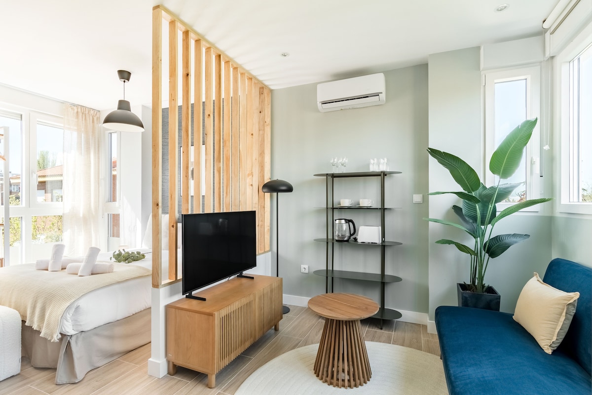 Stayswift ofrece este moderno estudio en Hortaleza totalmente diáfano, reformado y amueblado. Situado en Pinar del Rey, una tranquila zona de Madrid cercana a IFEMA y con fácil acceso al centro. De 27 m2 dispone de un cuarto de baño amplio y moderno con bañera para dos personas, cocina completa con todo lo necesario. Cama de matrimonio y sofá cama. Es ideal para parejas, pero puede acoger hasta 4 personas. Zonas verdes e infantiles. Metro, líneas de autobús, aparcamiento sin restricciones.