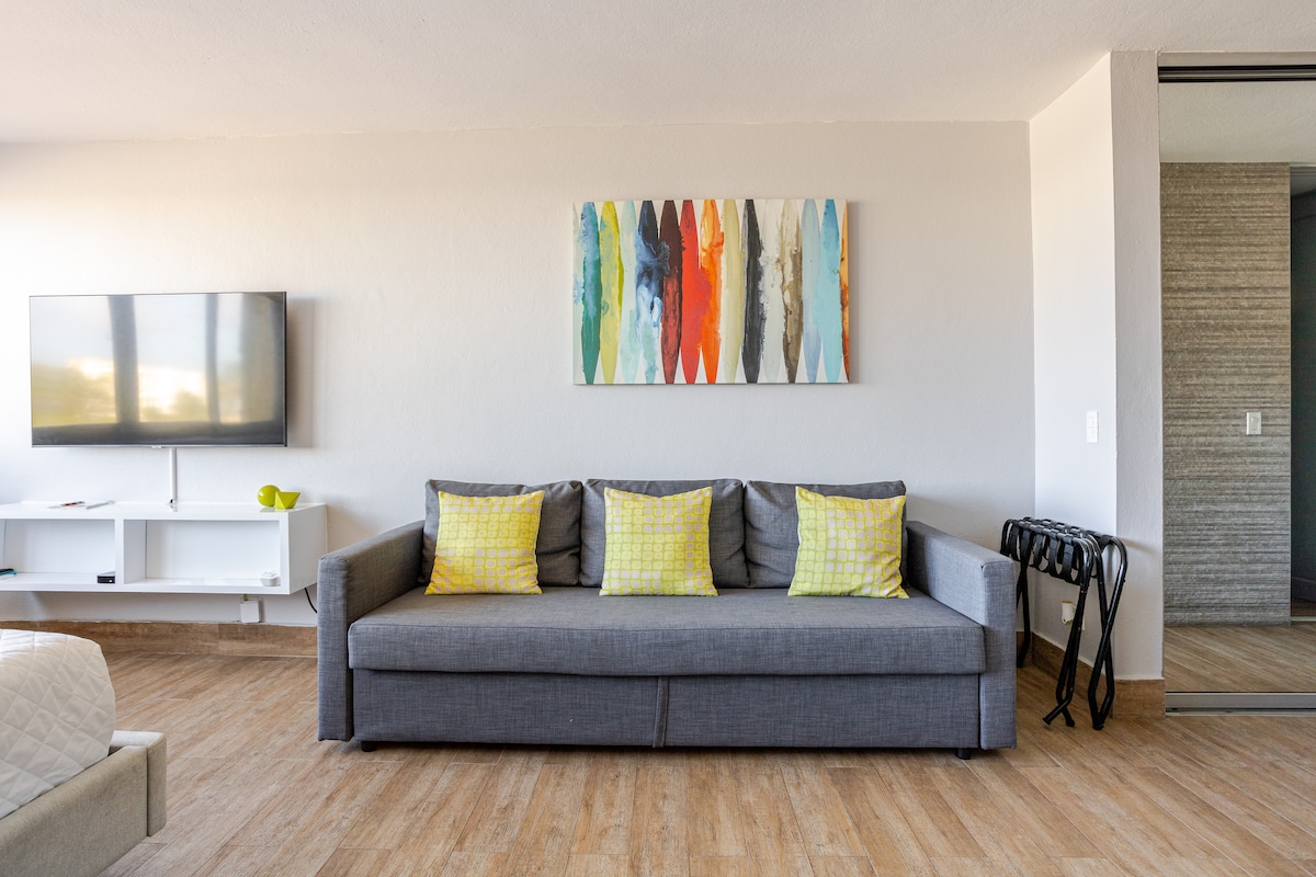 Studio with ocean and city view in the heart of Condado with direct access to the beach and walking distance from main touristic avenues, restaurants, shopping centers, hotels, casinos and night clubs. Building includes private pool, tennis court, gym, games room (with pool and ping pong tables), reading room, coin laundry room and a small concierge at the lobby. Parking inside the building premises and 24/7 security guards. Space for 4 guests, 1 queen bed, 1 sofa bed (double), 1 futon (double)
