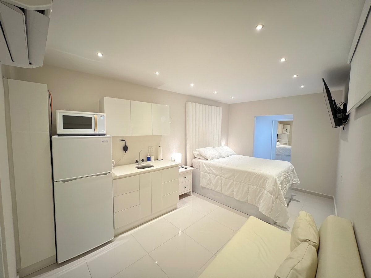 Newly renovated studio apartment directly across the street from easily accessible Condado Beach in San Juan. It's less than 10 minutes away from the airport and centrally located within walking distance to restaurants, bars, casinos and shops. Enjoy the beautiful ocean views from the balcony, and the many amenities this property offers, including a “work from home” space.