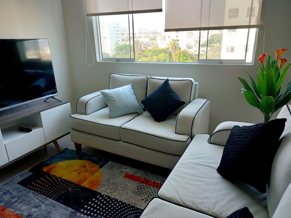 Descubre este acogedor departamento de 1 dormitorio en una de las zonas más seguras de Lima, a un paso de Miraflores. Ideal para viajeros que buscan comodidad y excelente ubicación, cuenta con sala, cocina equipada, WiFi de alta velocidad, así como un lindo balcón ideal para relajarse. Disfruta de la cercanía a restaurantes, cafés y parques, con fácil acceso al centro de Miraflores, o cualquier parte del centro de la ciudad. Perfecto para estancias cortas o largas. ¡Te sentirás como en casa!