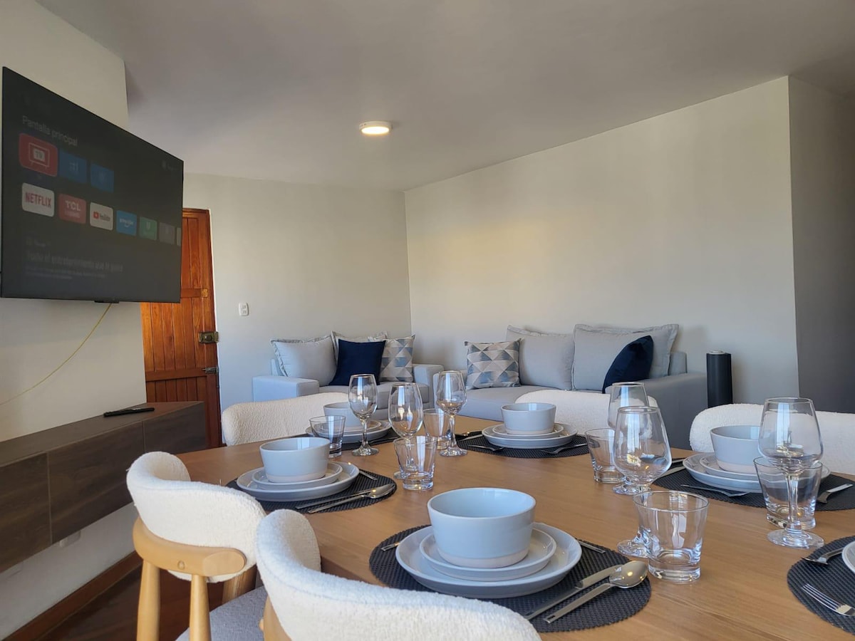 Acogedor y moderno departamento ubicado en el 4to piso, ideal para familias o grupos de hasta 6 personas Cuenta con tres dormitorios: Dormitorio principal con cama Queen y TV de 50". Dos habitaciones adicionales, cada una con cama de dos plazas. La cocina está totalmente equipada para que disfrutes tus comidas como en casa. El comedor incluye una TV de 55", perfecta para compartir momentos en grupo. Además, dispone de lavaseca y agua caliente, para una estadía cómoda y sin preocupaciones.