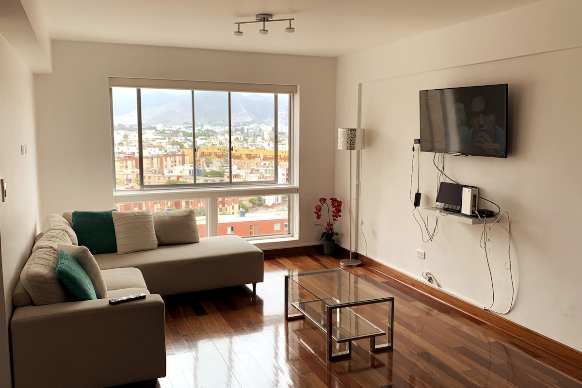 Live Lima from the 20th floor with stunning views! 🛏️ KING bed 📺 65" TV 🛋️ Comfy sofa 🍳 Fully equipped kitchen 🏊 Pool, 🔥 BBQ, and 🍸 Lounge Bar (subject to availability) 🚗 Parking for USD 8/night (subject to availability) 🧳 Store luggage before check-in or after check-out 📍 Prime location between Miraflores, San Isidro, and Surquillo 🌟 With a 4.96 rating and Superhost status, I offer you a comfortable and safe stay. 📅 Book now and enjoy Lima from the top, with style and comfort!