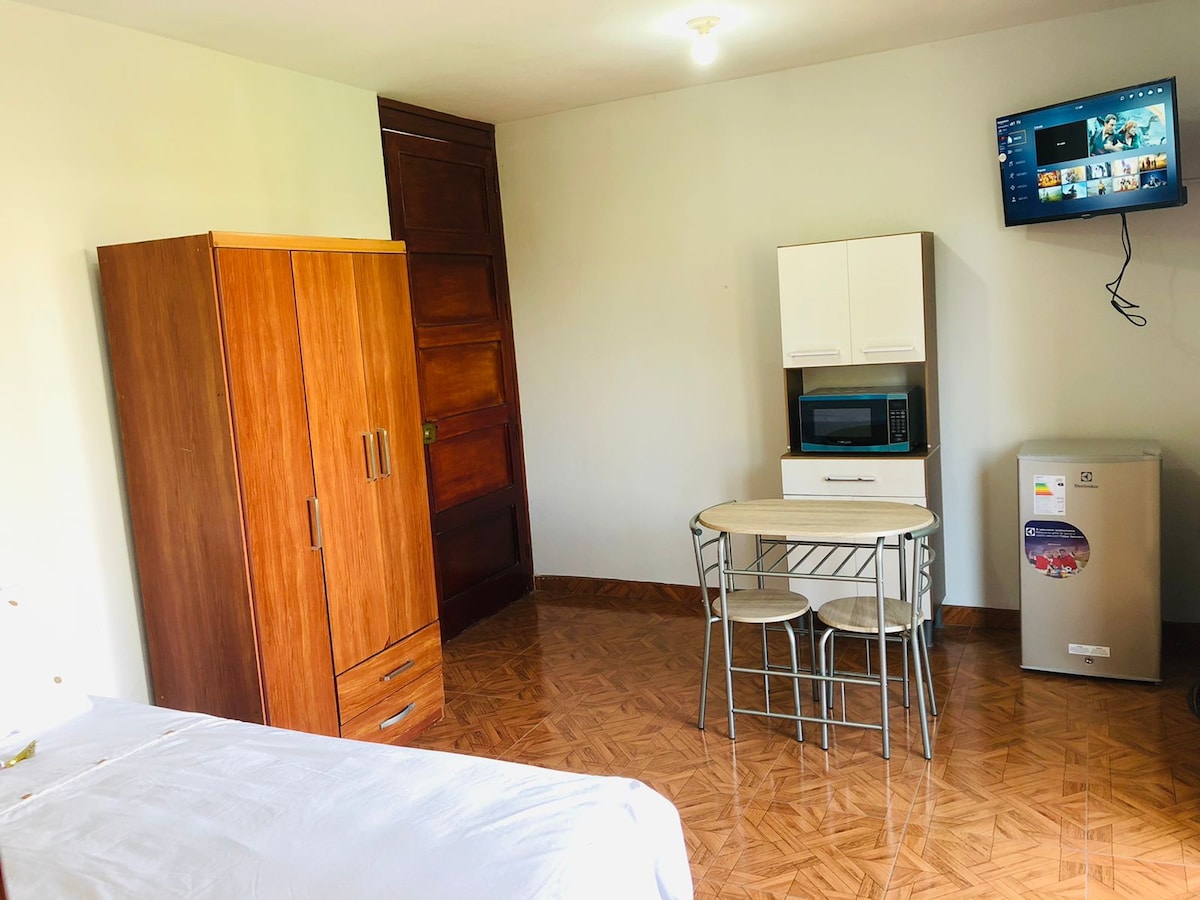 Este monoambiente ha sido diseñado para una estancia funcional y agradable. Realizamos limpieza profunda a vapor, ideal para personas alérgicas o que están adaptándose al clima húmedo limeño. Nos encontramos a solo 3 minutos caminando del Hospital Neoplásicas. A 15 min Miraflores. • Cama de 2 plazas • WiFi de alta velocidad, perfecto para trabajo remoto . • Smart TV de 32” • 1 baño completo • Cocina equipada No apto para sillas de ruedas, niños pequeños y mascotas.