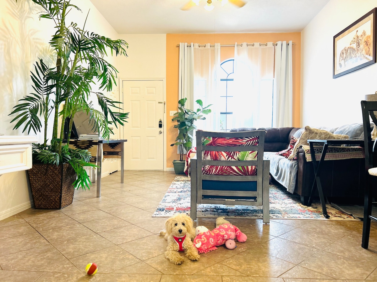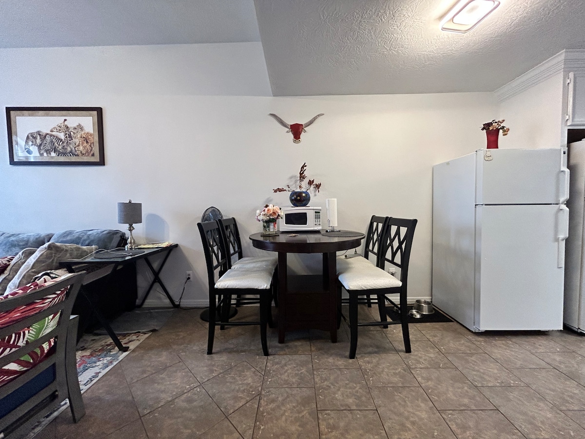 Welcome to our cozy studio apartment with its own private entrance, nestled alongside our home for your seclusion and convenience. It features a king-size bed for a peaceful sleep, a fully-equipped kitchen, and a comfy couch with TV for relaxation. Enjoy meals at the dining table and use the desk for work needs. Ideal for both leisure and business stays, our studio combines comfort with essential amenities to ensure a delightful visit.