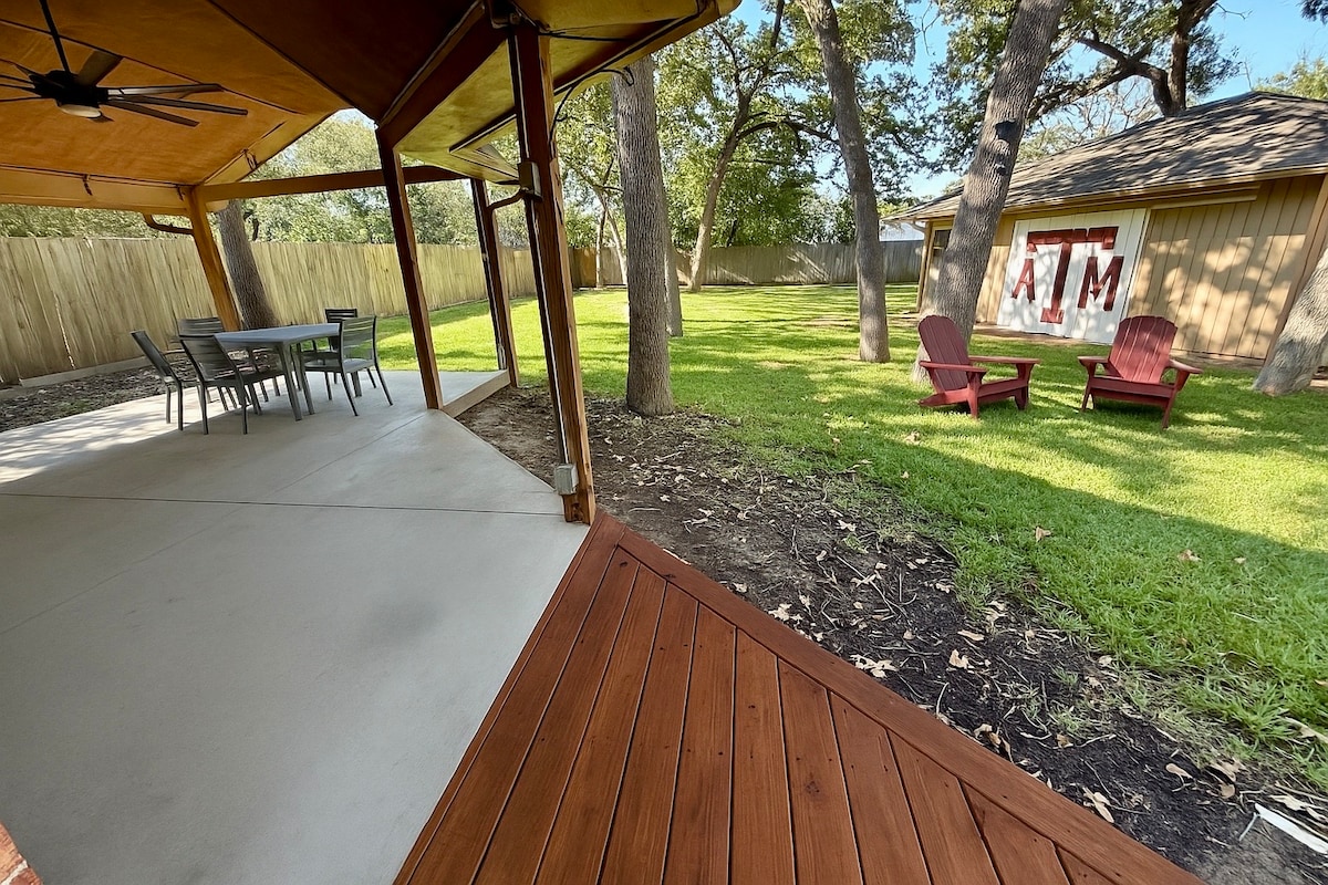 Relaxing updated 1796 sq ft home perfect for hanging out or grilling by the backyard unheated pool (no hot tub or spa) on a quiet cul-du-sac. The master bedroom has an on-suite, private deck, and king bed, and each of the other 3 bedrooms has a queen bed. 6 miles from Kyle Field; 3.7 miles from the free Game Day shuttle. Easy access to all major roads, but still in a laid-back neighborhood. Close to 4 parks, major shopping, bowling, laser tag, restaurants, and more.