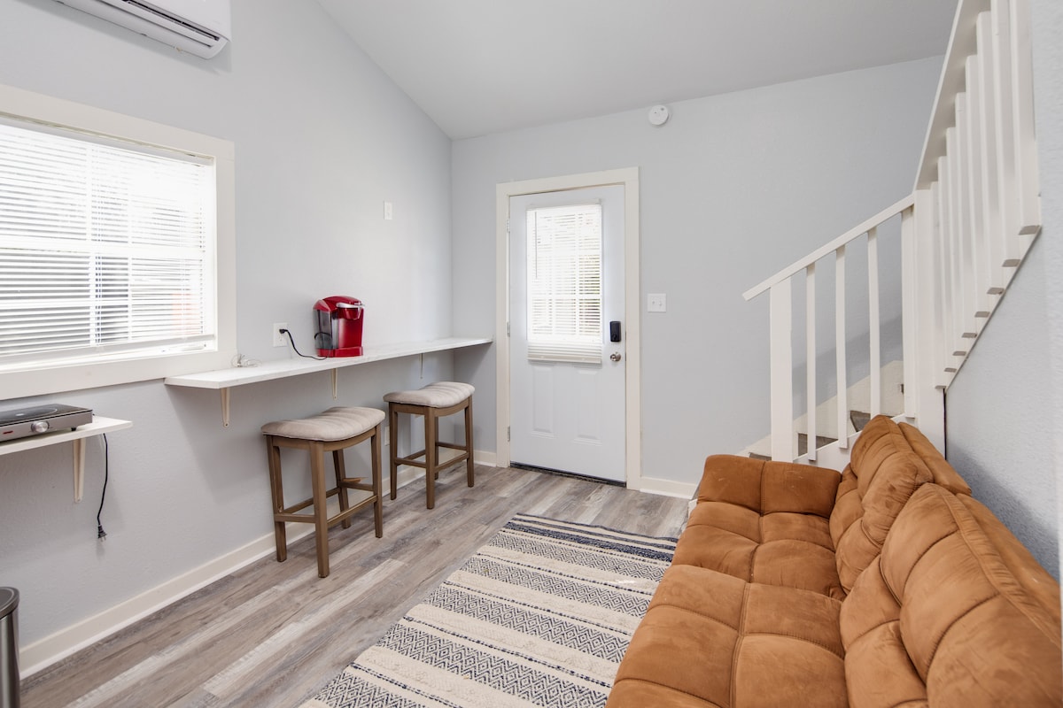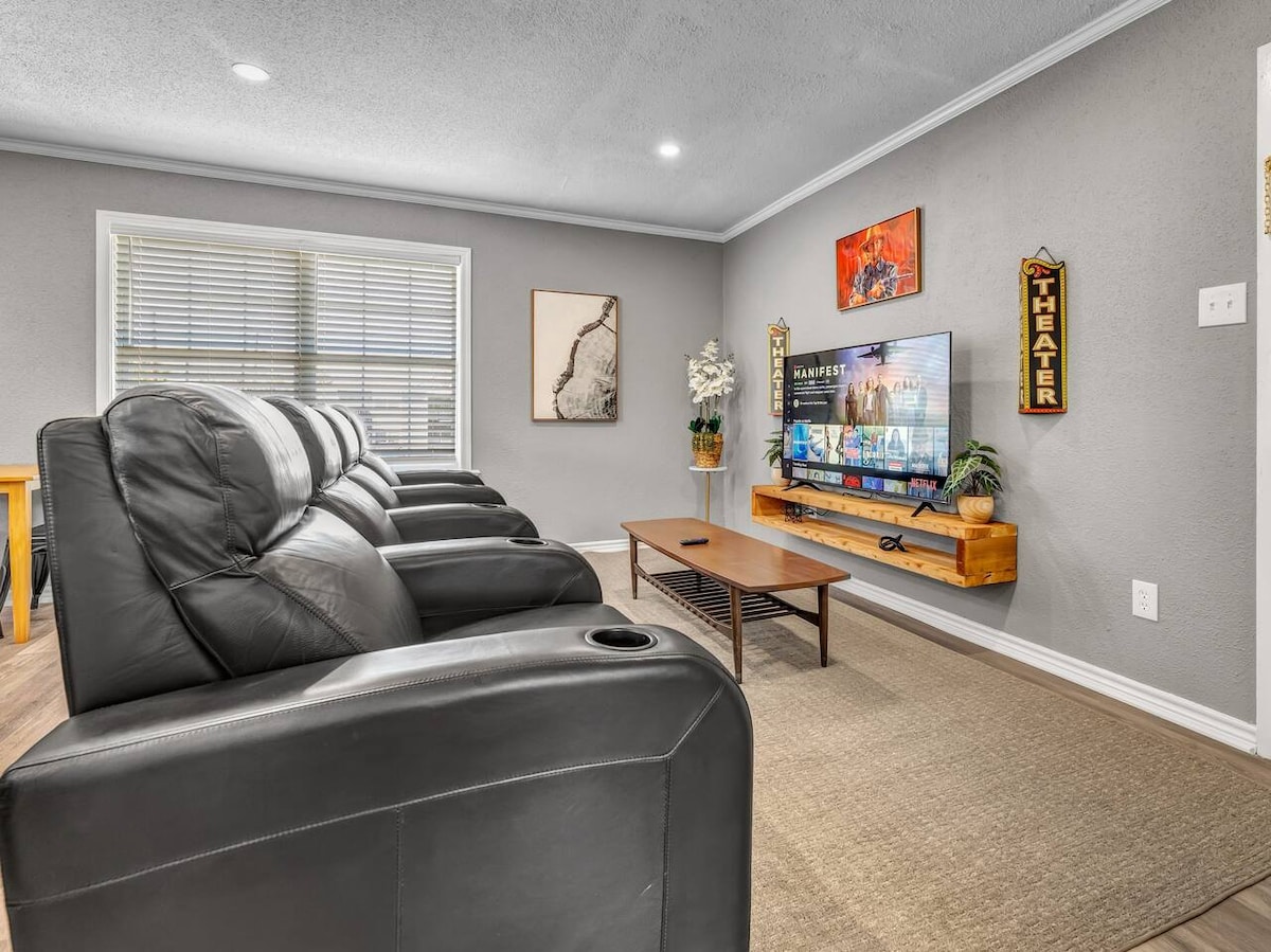Enjoy a stylish/fun experience at this centrally-located unit just a couple of blocks from the campus of Texas A&M University. This unit is on the Bryan-side of campus, so it is convenient to everything Bryan/College Station. With leather, reclining theater chairs, a custom kitchen, and comfy king beds, this may be (probably is) the best AirBnB in Aggieland. Park right out front and you can walk to your unit in just a few steps. Or walk a bit further and enjoy the restaurants at Northgate.