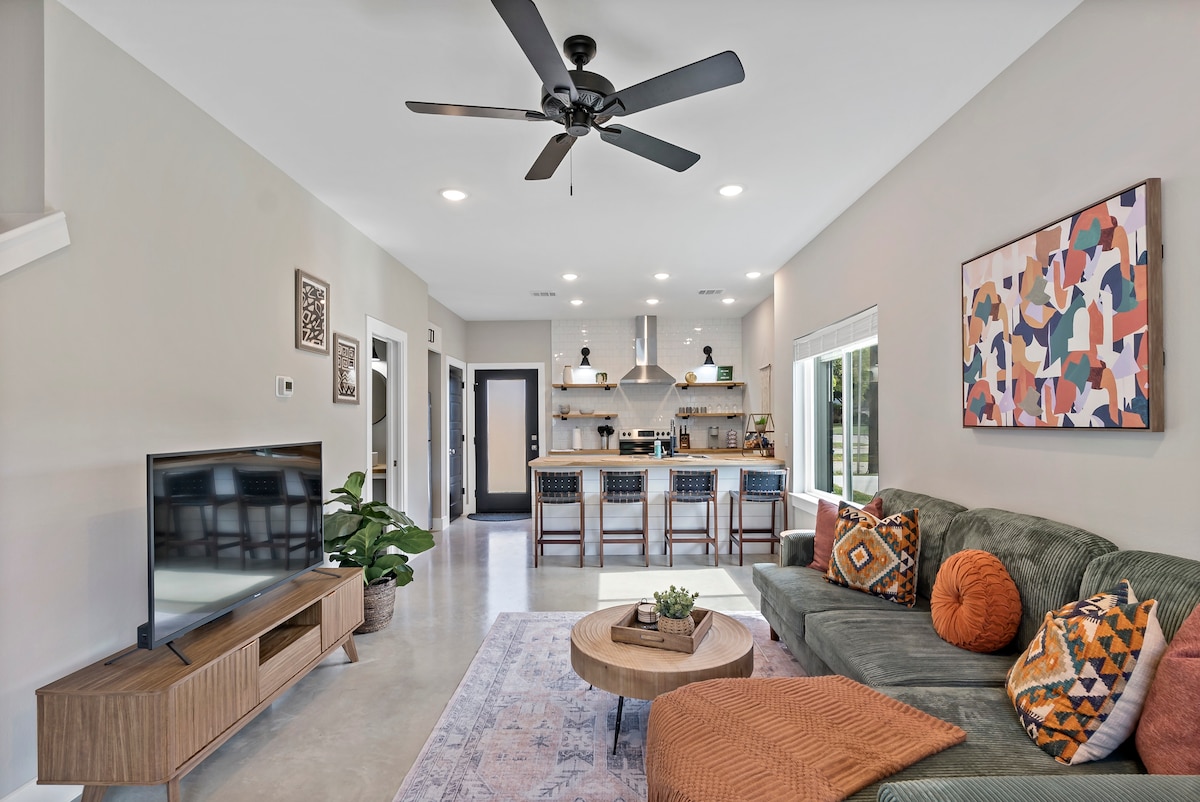 Relax in a brand new "Boho Modern" townhome located in the Historical Downtown Bryan & in walking distance to Ronin, Black Water Draw, RX Pizza, the Village, Cilantro, farmers market & many more Restaurants. Both bedrooms have king sized beds & master room/living room have 50 inch TVs. Log into your personal streaming account or use our Hulu, Disney+ or ESPN+, as a courtesy. Relax in private backyard or cook in the beautiful kitchen which includes a Keurig coffee maker with pods & creamers.