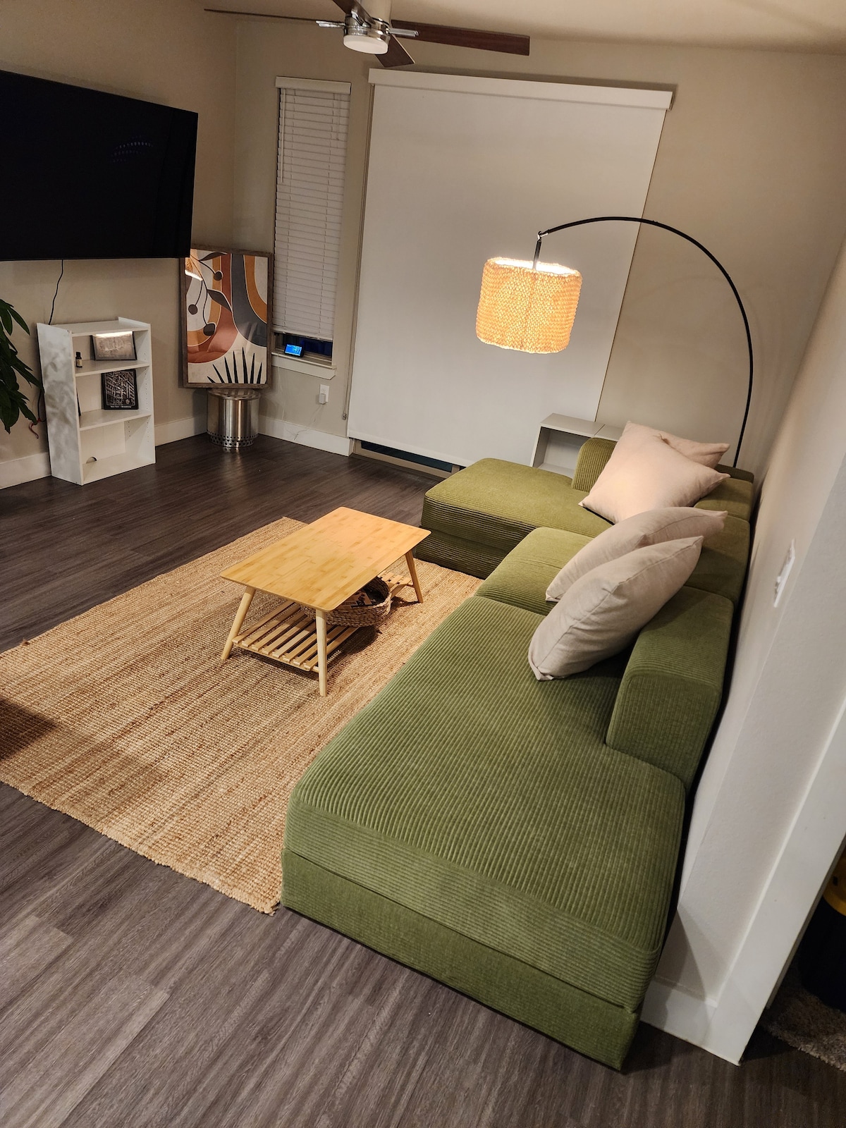 Welcome to your perfect summer getaway! Our apartment boasts a beautiful turf patio overlooking a large, inviting pool, perfect for relaxing or entertaining. Enjoy access to a state-of-the-art gym and a quiet, well-equipped office for all your fitness and work needs. The modern kitchen is ideal for cooking up delicious meals. Come and experience the best of summer living! Equipped with: keurig, pots and pans, dishes and utensils, glassware, wine glasses, bottle opener, mugs