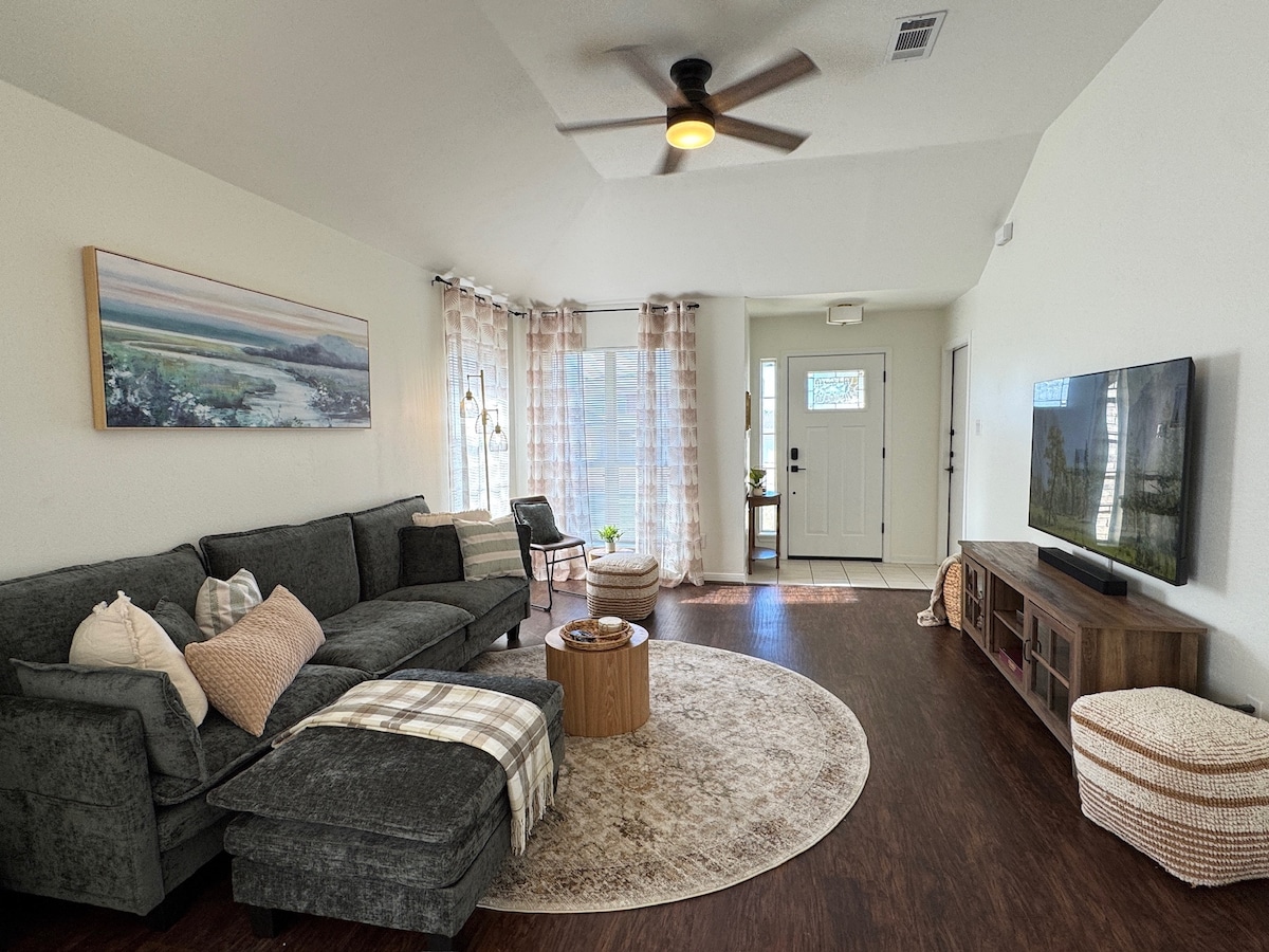 This newly renovated 4-bed 2-bath smart home is located just 4 miles from Texas A&M. With enough space to sleep 12 this home is perfect for group gatherings. The standout feature is a unique bunk room/movie theater that sleeps 6, offering the ultimate retreat. The open living room and breakfast area are designed to make it easy for everyone to relax and dine together. The home features a 200+ sqft covered porch and a 100+ sqft patio, perfect for outdoor meals and grilling.