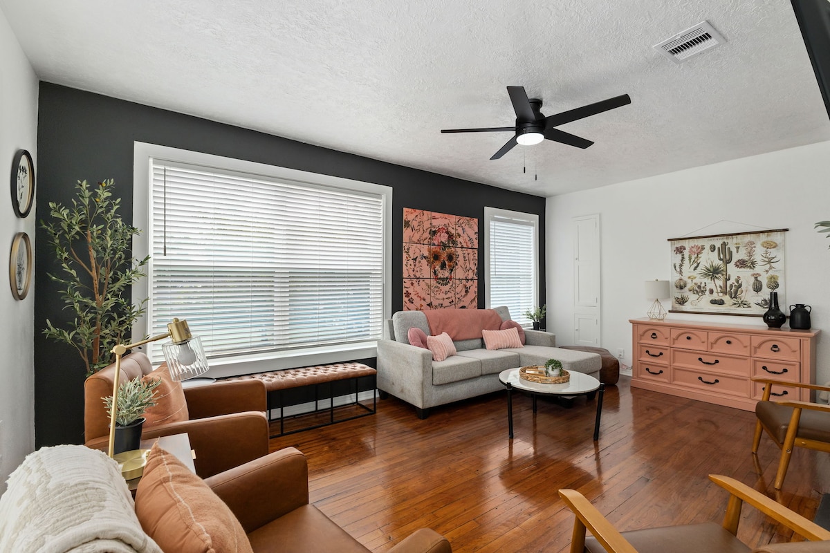 Step into moody elegance in this upstairs retreat in the heart of Bryan, TX. Designed with bold contrast, cozy textures, and a touch of dark romance, this curated space is perfect for guests seeking something a little different—a vibe. The skull floral mural, black accent wall, leather chairs, and blush accents add unique flair. Whether visiting Texas A&M or exploring Downtown Bryan, this stylish hideaway offers comfort, personality, and a memorable stay.