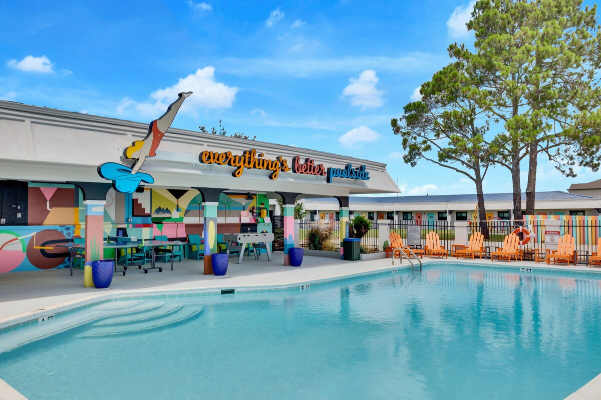 You are now entering Wonderland. Check-in to receive your free welcome drink from the all-local libations bar, then off you go. Explore the art gallery, swim in the saltwater pool, visit the Dolly Arcade, play chess on the life-sized board, grab a partner for Pickleball, or swing from a tree. If a 1970s resort and cheeky art hotel had a baby, this would be it. Oh, and there are no hidden fees. Parking, wifi, breakfast, coffee, shampoo/conditioner- its all free!