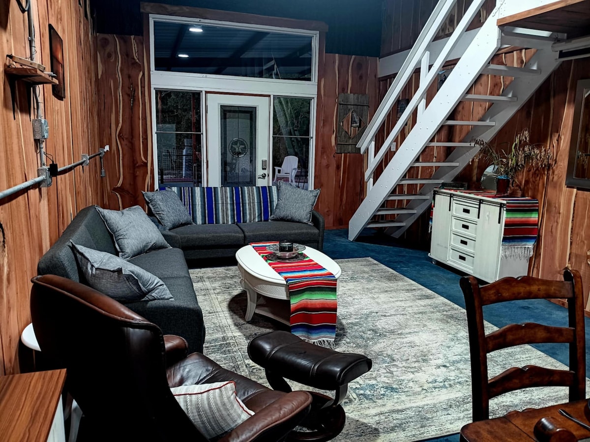 Come here to find your peace and quiet in the country, just outside of town. Relax by the pond during the day, and the fire pit at night. Watch the deer and squirrels while drinking your coffee under the huge covered patio. Enjoy the very unique rough cut local cedar interior of what was once a Harley Davidson motorcycle shop. If you have a larger guest list we also have full RV hookups adjacent to the building. Pet friendly, and the host is friendly too.