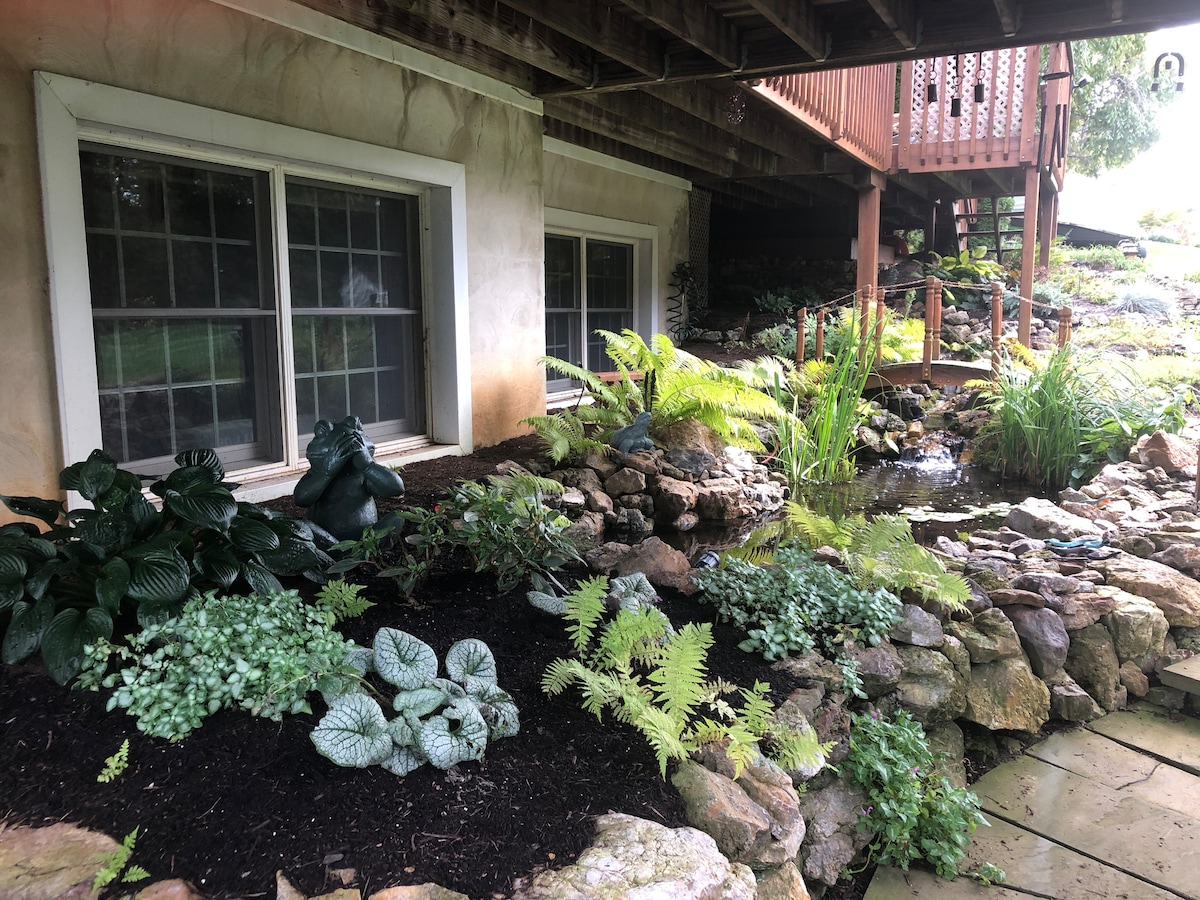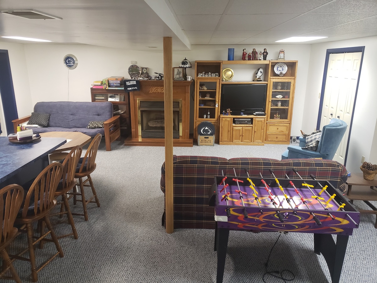Basement suite in Happy Valley! Perfect lodging for Penn State events, business trips, graduations and vacations. 2 bedrooms, 1 bath, with large living room and separate dinette area. Plenty of parking and no-contact private entrance. Home theater, fireplace, mini-fridge, freezer, toaster and microwave, with a lovely private patio next to a waterfall and fishpond. Suite is ideal for 1-4 guests and a queen airbed is available for 2 additional guests. $10 per guest per night beyond 4.