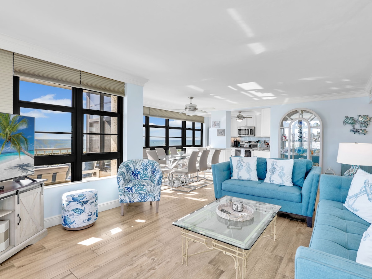 Enjoy our completely renovated, gorgeous 12th floor, 2 bedroom, full beachfront Marco Island getaway. Take in the spectacular views – especially the sunset – from throughout the apartment and from the wrap around balcony. You can enjoy stunning views of the powder white, 5-mile long beach, stretching from Cape Marco to Tigertail and Hideaway Beaches.