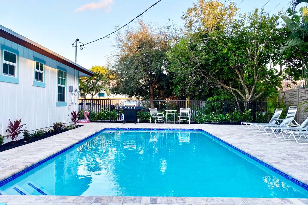 2023 Complete Remodel West of 41 .Private Heated Saltwater Pool w/ 6’ Privacy Fenced backyard. 1 miles to Vanderbilt beach Cottage with screened Lanai, 50 inch HD tv, gas blackstone grill w/ceiling fans and wet bar with refrigerator for outdoor living. Great house for small families or couples. Both rooms have king beds, so ideal for 2 couples. A sofa sleeper has been added to sleep 6. Quartzite countertops with travertine Marble floors. Beach chairs, coolers, towels, and sand toys