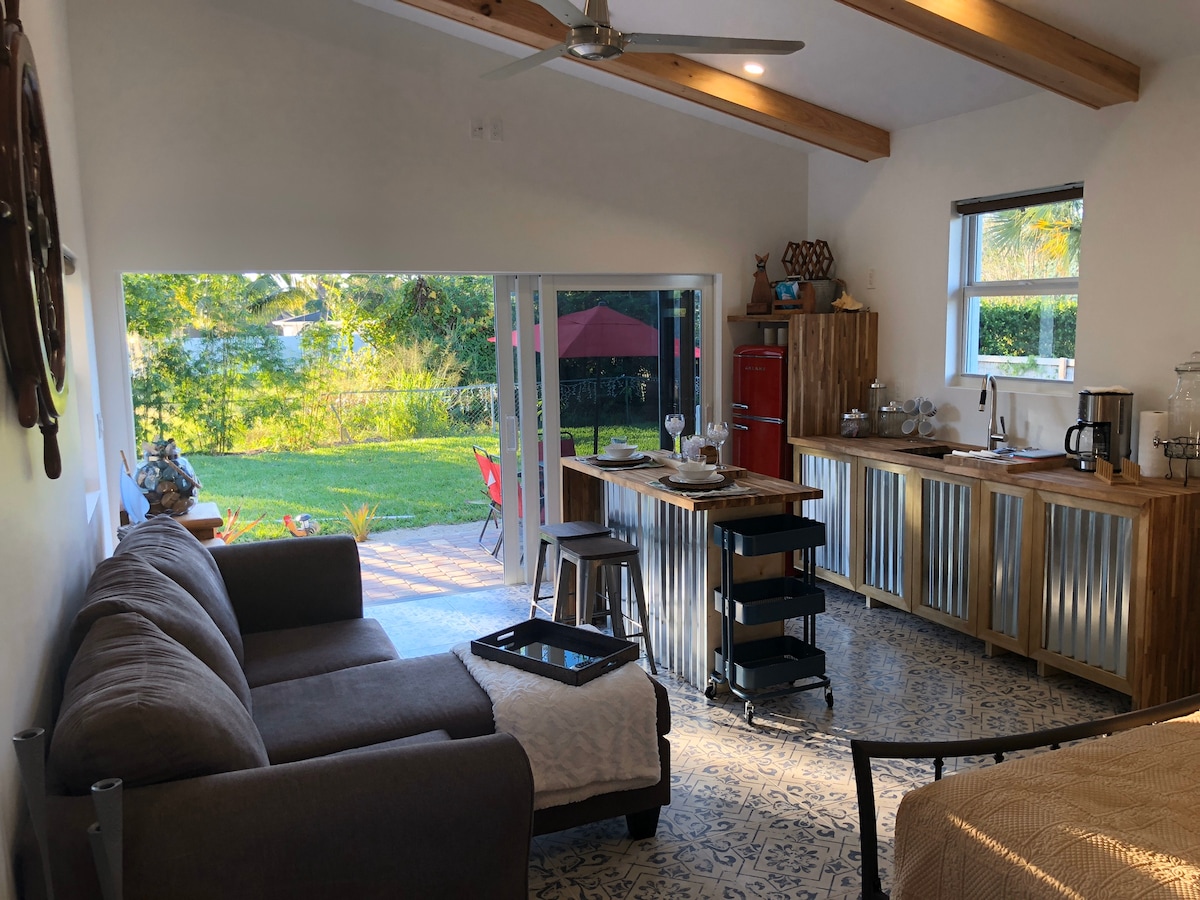 Beautiful newly built spacious studio in downtown Bonita Springs, 7 miles from the world famous Barefoot beach, and only 100 steps away from the popular Riverside park where many events and festivals are held. This spacious studio is modern with a very tall ceiling with exposed wood beams, well lit with giant slider doors, with a full sized kitchen and full patio area. Perfect for a couple on a get-away or even a single person just traveling for leisure or work. Clean at all times.