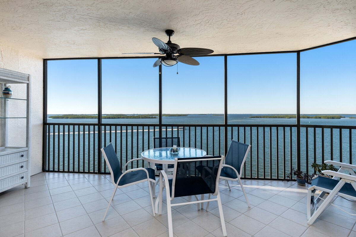 Million dollar views from this fully renovated condo on the top 17th floor at Sea Winds. 1200 sq foot condo 2 bedroom 2 full bath beach front condo on Marco Island. Best location on the beach, within walking distance 1/2 mile to 10 restaurants or enjoy 3 mile walk along the beach. Enjoy the pool, hot tub, pickle ball, and games. Weekly or monthly rentals available. New beds, full renovation, new furnishings, stocked kitchen to enjoy all the conveniences of home, and all the beach essentials.