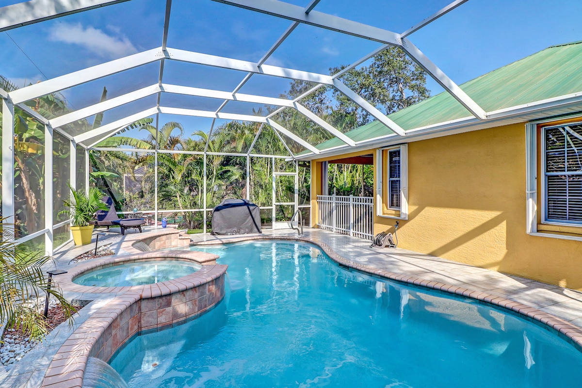 Unwind in this modern escape, perfect for up to 6 guests. The home features a hot tub, king-size bed, a convertible twin beds to a King size if desired, queen-size pull-out sofa. Enjoying BBQ on the screened large patio. With a 1-car garage and a LARGE driveway, plenty of room boat or RV. Located just 0.5 miles to Hyatt Regency Resort, 8 miles to beaches, 1 mile to Coconut Point Mall, 6 miles to Gulf Coast Center, 10 miles to Mercato, and 8 miles to RSW Airport.
