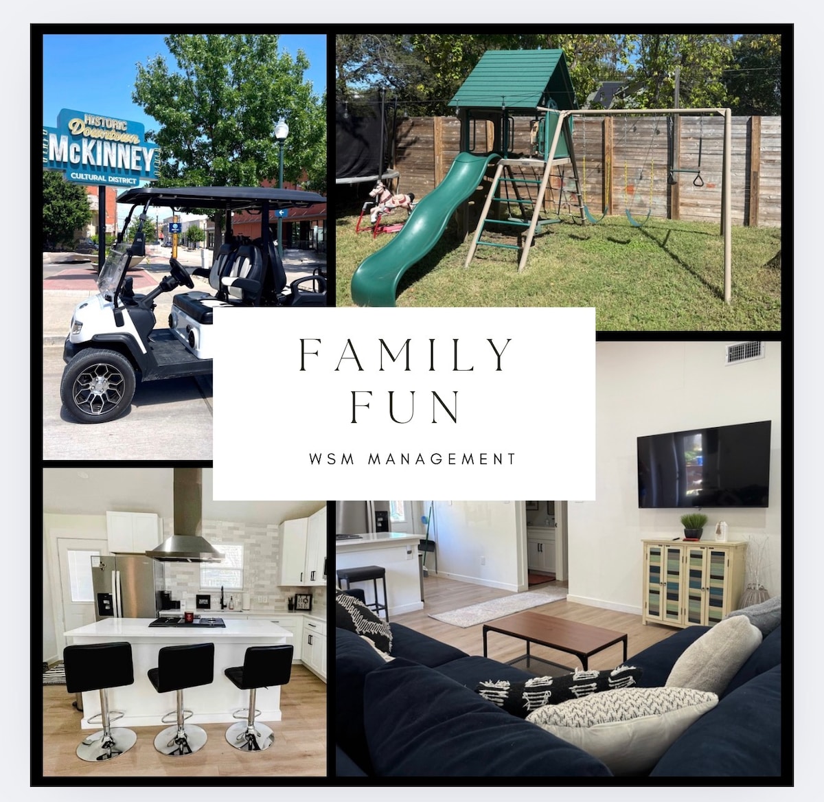 This beautiful 3 bedroom 2 bathroom is located 1 mile to downtown McKinney. Corner lot home is perfect for families! Hi speed internet and smart TV’s throughout. The Primary features a Queen size bed with attached full bathroom. Children’s room features a twin bunk bed with plenty of toys, books and games for the little ones! 3rd bed is queen with workspace. Backyard has trampoline and large play structure with swings and more! GOLF CART NOW AVAILABLE FOR RENT!!